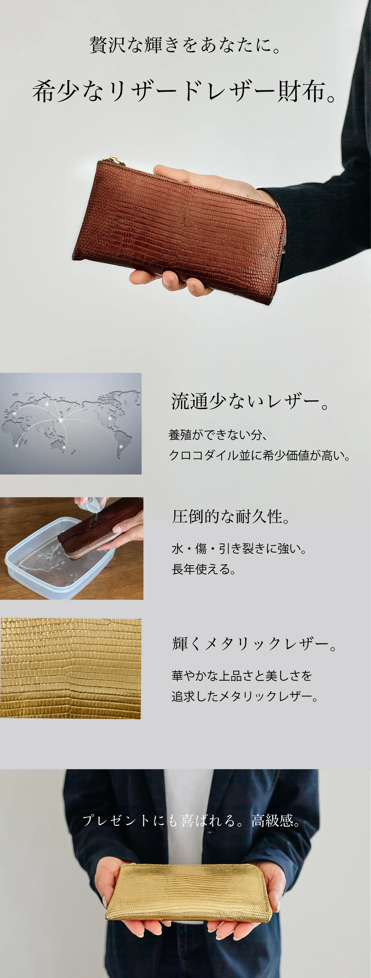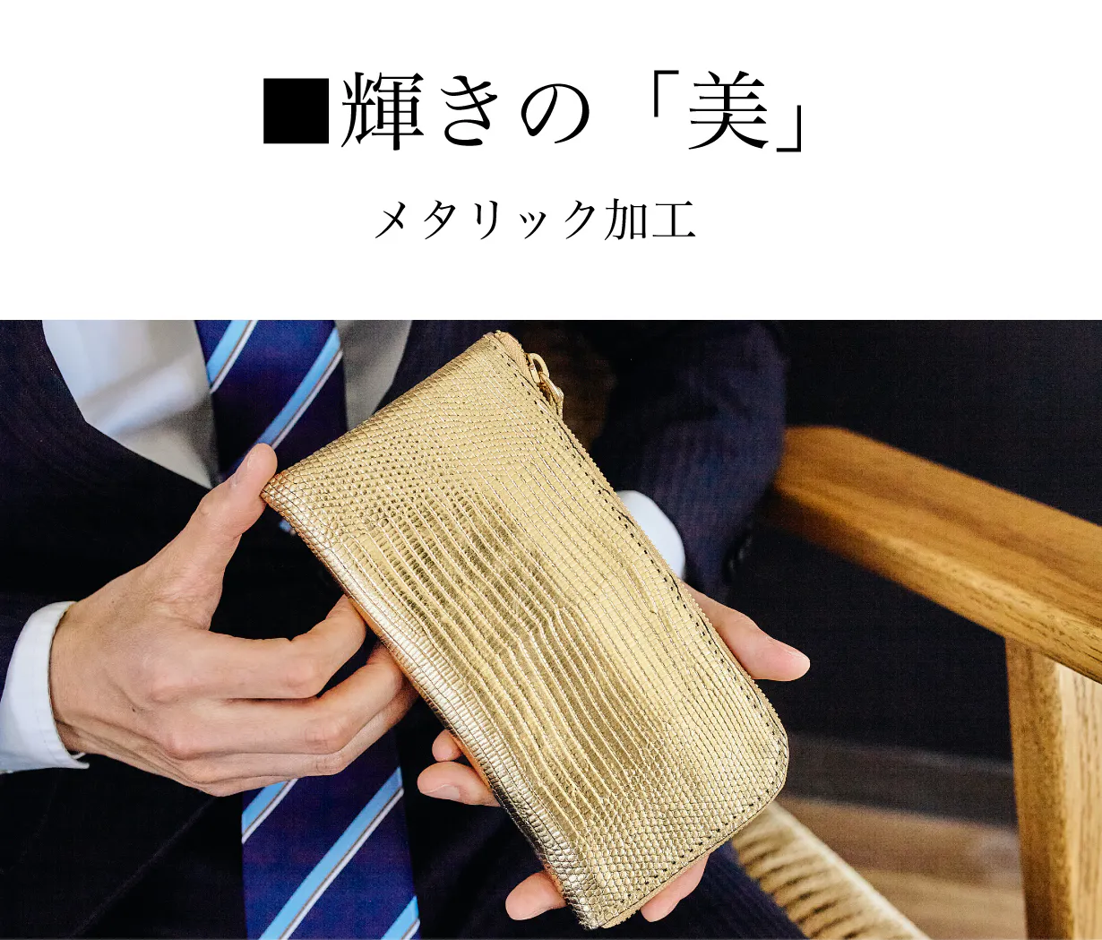 今回はリザードレザーを染めるだけでなく、メタリック加工を施し細かい鱗模様をさらに引き立たせています。