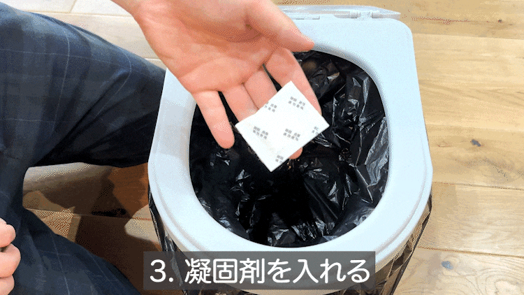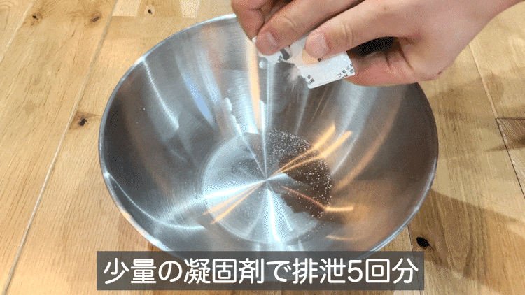 小さな専用凝固剤1つで、約1L、5回分のトイレが可能です。