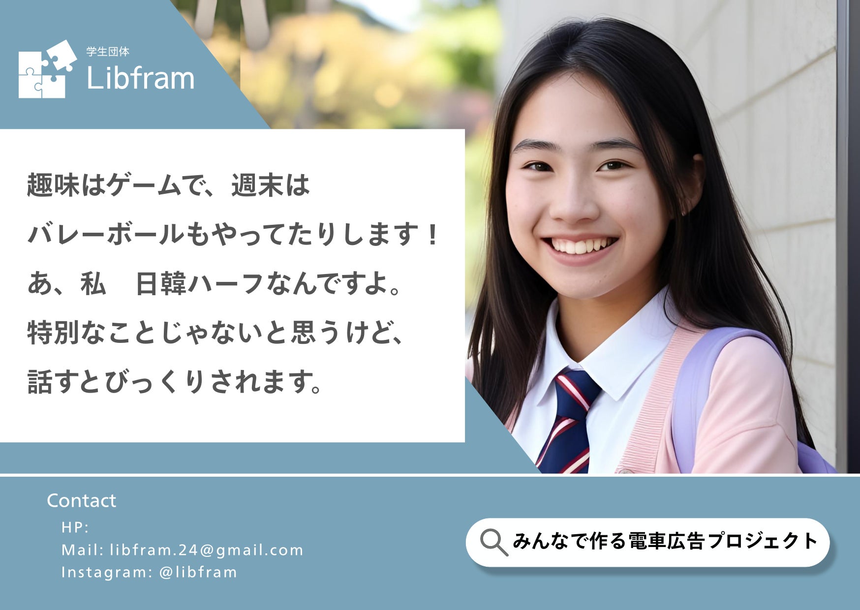 このプロジェクトは、高校生団体Terapho様が実施された「ちなみにキャンペーン」のアイデアに許可を得た上で着想を得て、私たちLibframが独自に企画・実施しているものです。なお、Terapho様と私たちLibframは系列団体ではなく、今回のプロジェクトに関する関与も一切ございません。