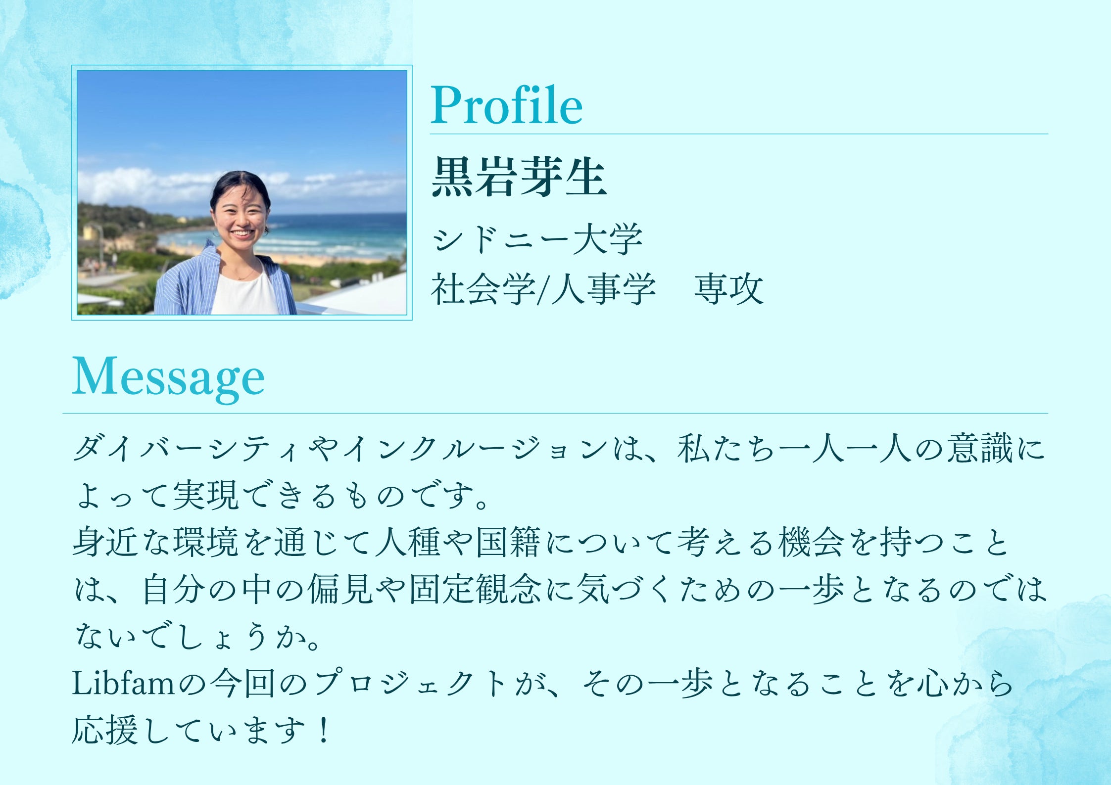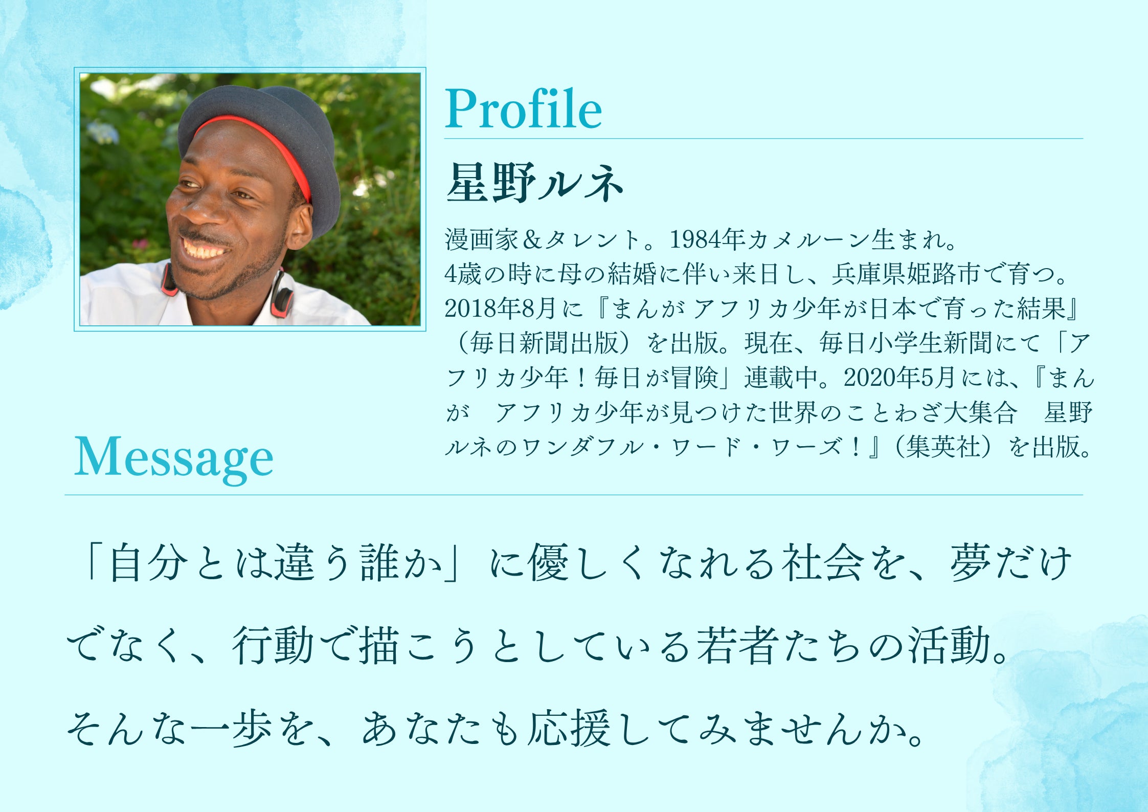 趣味などのありふれた自己紹介を最初に入れることで、多様なルーツを持っている人々が遠い存在ではなく身近な存在でリアルに感じてもらうことを目指しています。