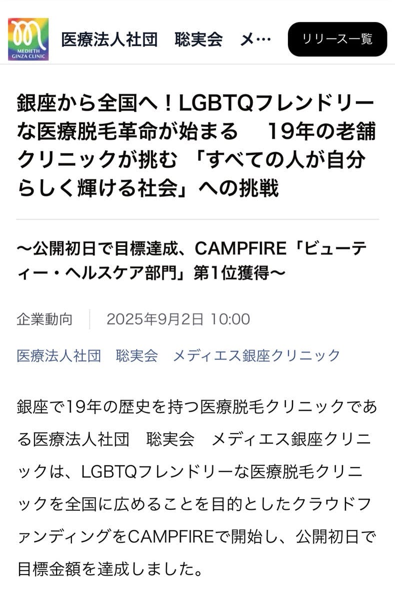 「銀座から全国へ! LGBTQフレンドリーな医療脱毛革命始まる」というタイトルで、