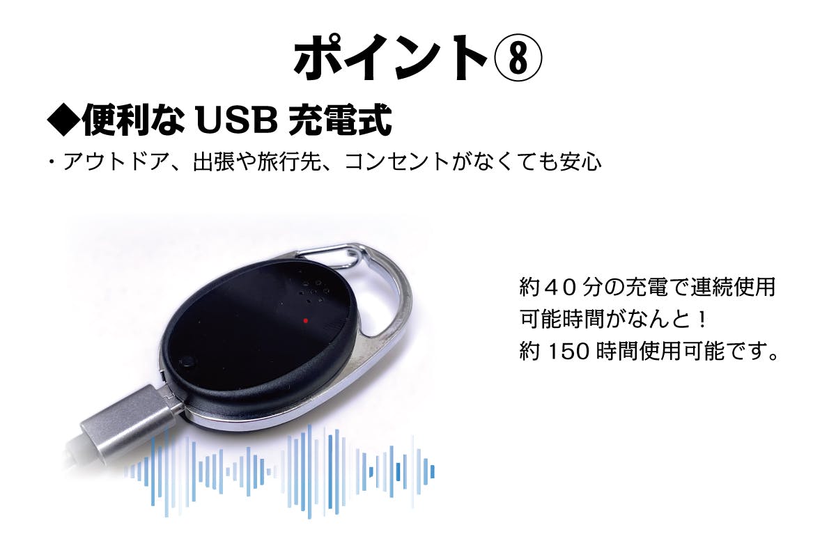 人の耳に聞こえる外出モード、室内モードと、人間の耳には聞こえない睡眠モードの3種類のモードに切り替えが可能です。室内、屋外、就寝時に使い分けることが可能です。蚊の嫌がる特定の周波数の音波を出し、効果的な蚊よけ効果を持続します。