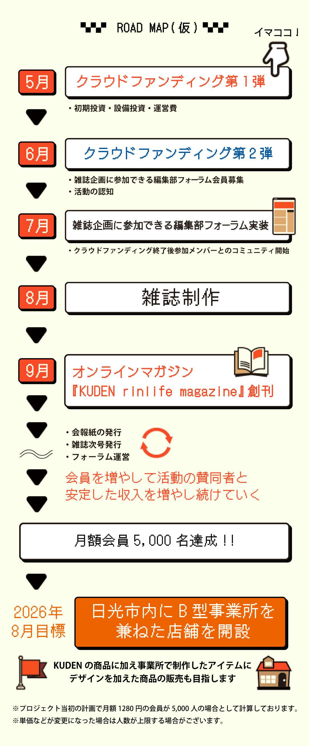 収益モデル仮の試算ですが、マガジンのサブスクリプション価格を月額1,280円(税込)とし、5,000人の登録者が集まった場合、月間約600万円の収益が見込まれます。この資金をもとに、KUDENのライフスタイルブランドを扱う実店舗をオープンし、そこをB型事業所として活用します。店舗ではKUDENのファッションや文具、小物に加えて、地域の人々に親しまれる和食やパンなど、日本製のこだわり食品も製造・販売していく予定です。※プロジェクト当初の計画で月額1280円の会員が5000人の場合として計算しております。※単価などが変更になった場合は人数が上限する場合がございます。