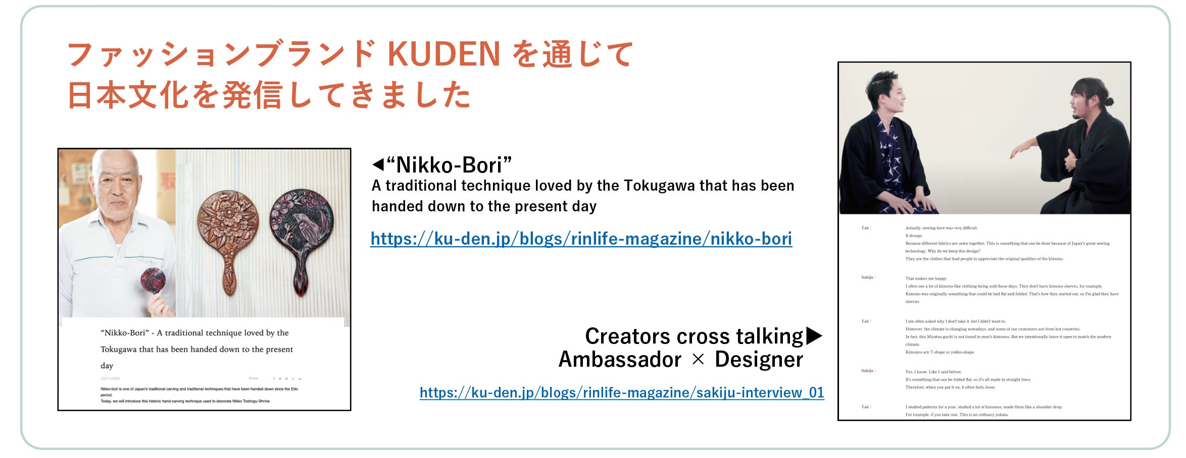 ファッションブランドKUDENを運営するGerbera Design株式会社は、もともとデザインを専門とする会社です。このたび、KUDENとして初めての実店舗を、日光の地に開設したいと考えています。店舗では、KUDENの着物モチーフのファッションをはじめ、日光の知られざる魅力や地元の名品を、デザインの力で再編集・ブランディングし、国内外のお客様にご紹介します。