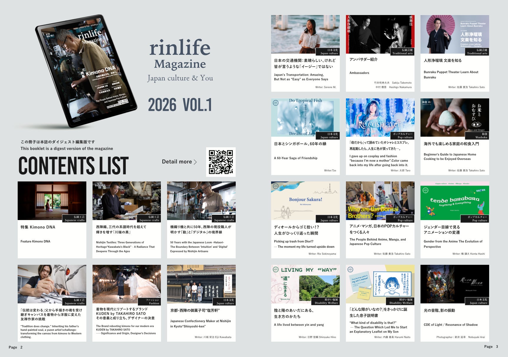 2025/10/16 15:06ご支援くださった皆さまへいつも温かいご支援を本当にありがとうございます。皆さまのお力添えのおかげで、rinlife Magazine創刊号の制作が着実に進んでおります。当初10月を予定しておりましたが、英訳や最終レイアウトの仕上げに時間を要しており、より良い形でお届けするために、創刊を11月に変更させていただくことになりました。アンバサダー就任のご報告このたび、人形浄瑠璃 文楽の竹本咲寿太夫さん、そして歌舞伎俳優 中村橋吾さんが、KUDEN rinlife Magazineの理念に共感し、アンバサダーとしてご参画くださいました。歌舞伎や文楽といった日本の伝統芸能の担い手であるお二人の参加は、本誌の活動が単なるメディア事業にとどまらず、「日本文化の精神を未来へ手渡す」ための取り組みであることを力強く裏付けるものです。創刊号 掲載予定内容特集:「Kimono DNA」・西陣織 織元 有限会社川端(伝統工芸)・濡れ描き友禅 碧ao(伝統工芸)・Next Kimono KUDEN by TAKAHIRO SATO(着物&ファッション)アンバサダー就任・人形浄瑠璃 文楽 竹本咲寿太夫(伝統芸能)・歌舞伎 中村橋吾(伝統芸能)人形浄瑠璃 文楽 特集 第一弾・竹本咲寿太夫さんインタビュー(過去のインタビュー全文公開)その他・「おむすびってなに?」(日本食)・「盆栽ブラザーズ」(アニメ・マンガ)誌面は100ページを超える内容となり、日本の職人・芸能・アート・食文化を多角的に伝える構成です。皆さまのご支援が、この挑戦の礎となっています。心からの感謝を込めて——ありがとうございます。創刊号が完成しましたら、支援者の皆さまへいち早くお届けいたします。どうぞ引き続き、rinlife Magazineの歩みを見守っていただけましたら幸いです。佐藤貴浩KUDEN by TAKAHIRO SATO/rinlife Magazine 編集部 もっと見る