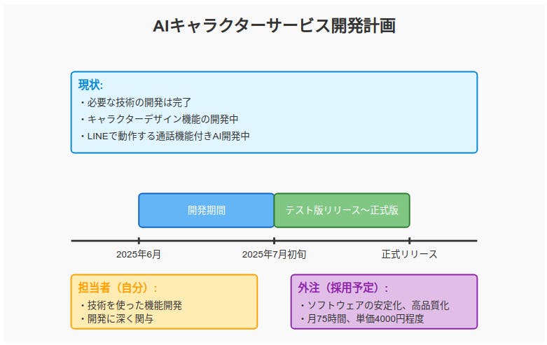 このプロジェクトを実現するために必要な技術の開発はすでに終えており、現在はそれらを組み合わせて、キャラクターデザイン機能、LINE上で動作する通話機能付きのAIを開発中であり、技術的な目処も立っております。例えば、声を作るコア技術は開発済みです。正式リリースに向けては、品質の高いサービスを提供するため、優秀なソフトウェアエンジニアを1名採用予定です。私自身も引き続き、開発に深く関わります。担当は下記のとおりです。