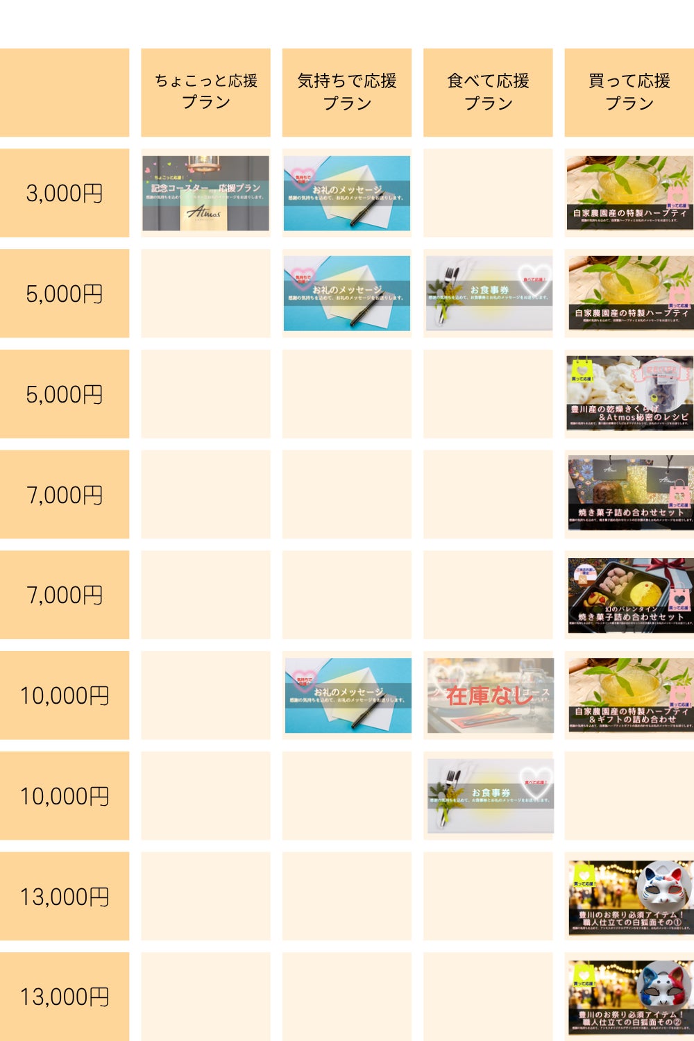 人気の焼き菓子詰め合わせセットや、おせち料理など、Atmosならではの商品をお楽しみいただける品々です。※ネクストゴールへの挑戦を支えてくださる協力業者さまのお力を借りて、特別なお品もリターンとしてご用意しました。