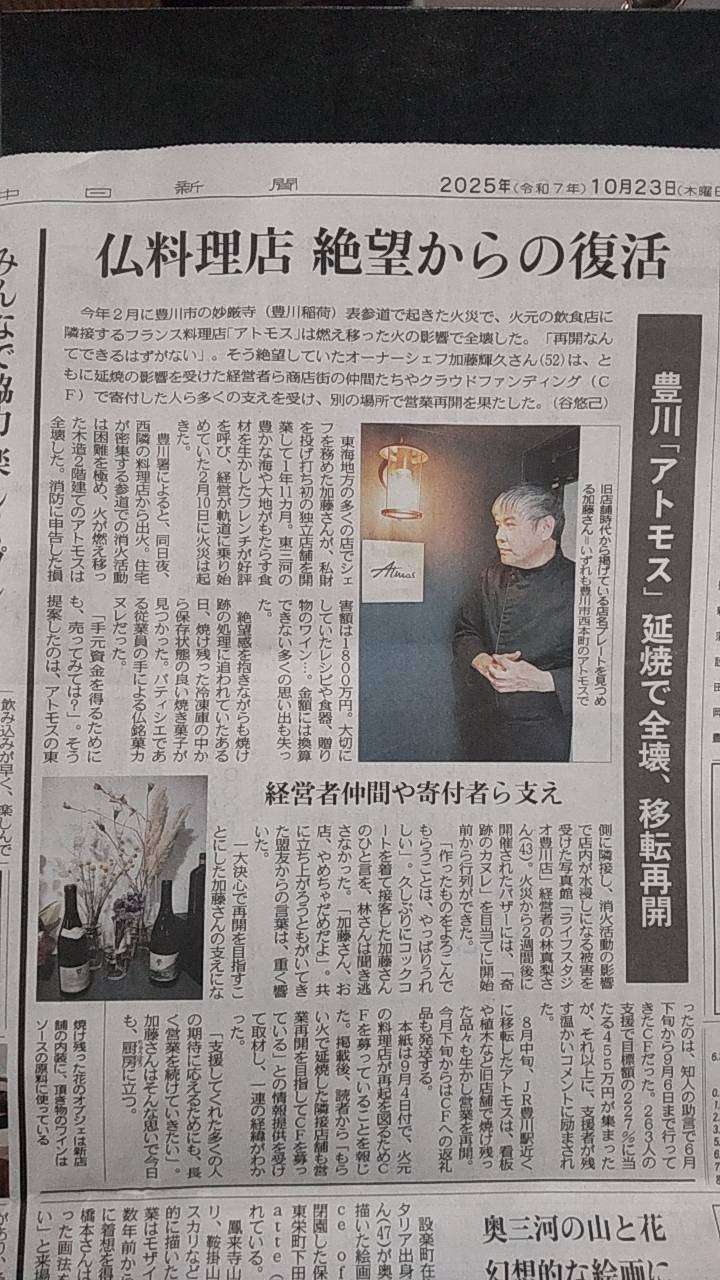 2025/10/26 11:39こんにちは、アトモスです。皆様、いかがお過ごしですか?このたび、当店のこれまでの歩みとクラウドファンディングでの挑戦について、中日新聞(2025年10月23日付)に取り上げていただきました。 「仏料理店 絶望からの復活」という見出しで、延焼による全焼から再開までの道のり、そして皆さまからのご支援の力について丁寧に紹介されています。今回こうして取材を受けることができたのも、クラウドファンディングを通じて出会えた支援者の皆さま、そして地域の皆さまの応援があったからこそです。 改めて、心より感謝申し上げます。【一部で生じたご心配について】なお、過日、この火災に関連した別途クラファンの報道もなされました。 一部の報道が支援者さまに誤解を与えていたとしたら、本意ではありません。あらためて、このプロジェクトは「もらい火(延焼火災)によって全焼したアトモス」の復興と、再び地域に根ざした営業を目指すためのものです。 この点を明確にお伝えさせていただきます。【リターンの発送について】現在、すべてのリターンについて鋭意準備を進めております。 お食事券や物品等、10月末から順次発送予定ですので、今しばらくお待ちいただけますと幸いです。 引き続き、アトモスを温かく見守っていただけますよう、どうぞよろしくお願いいたします。フレンチレストラン Atmosオーナーシェフ 加藤 輝久 もっと見る