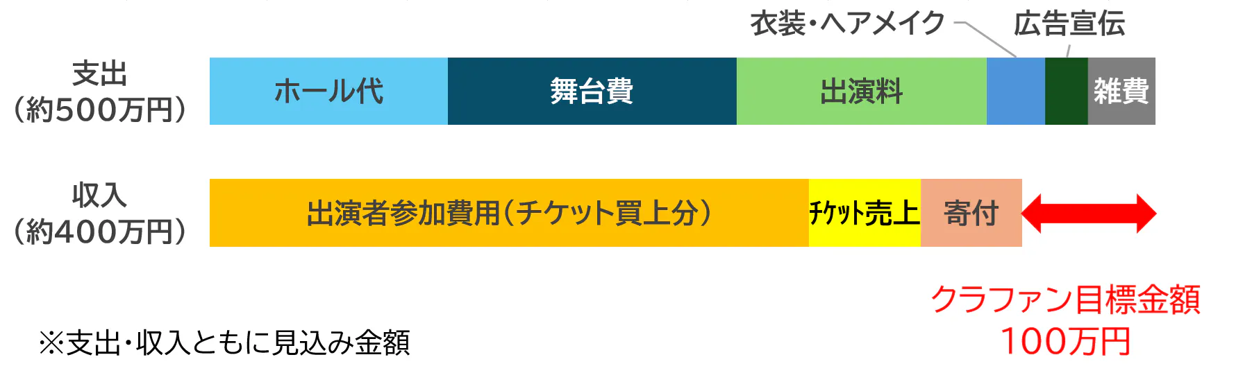 必要経費 約500万円のうち、運営費の不足分にあたる100万円を