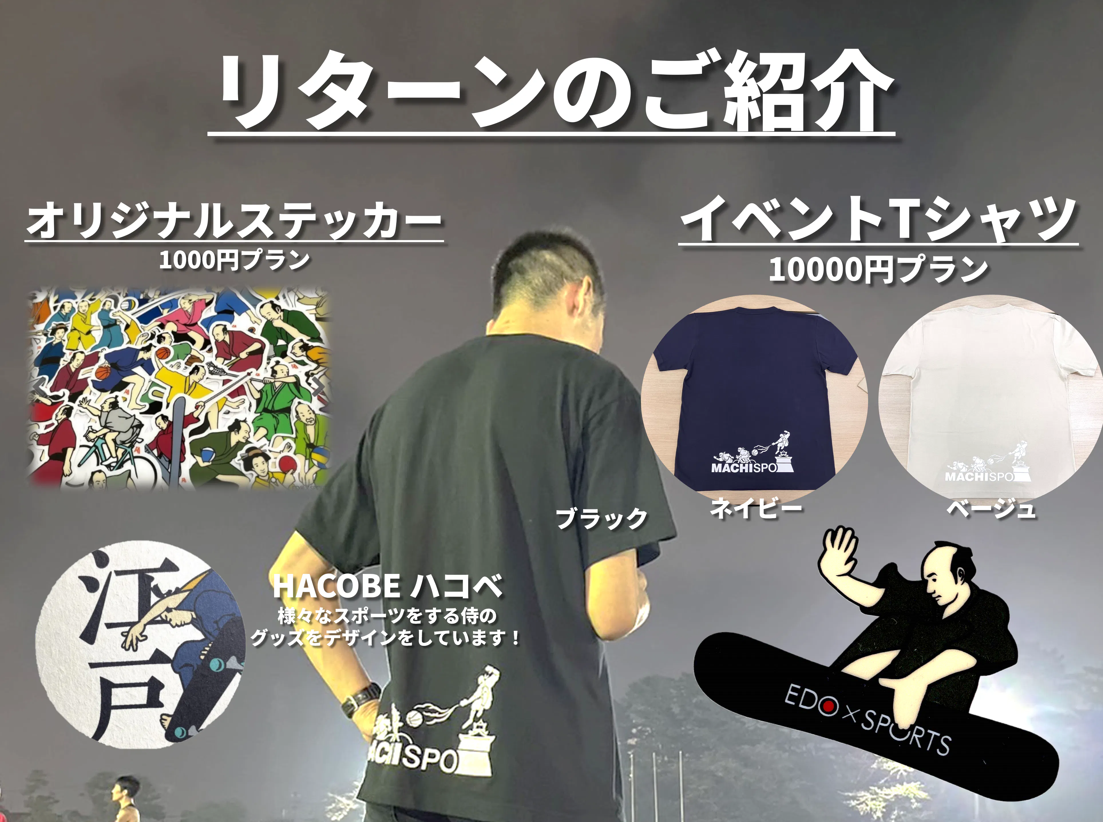 ・盛り上げ侍のご支援 10,000円:①御礼の写真付きメール ②EDOデザインオリジナルス テッカー ③まちスポコラボTシャツ
