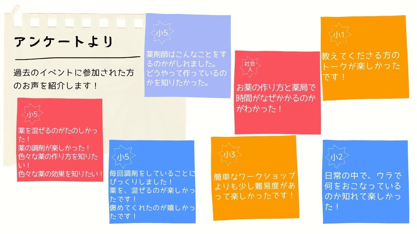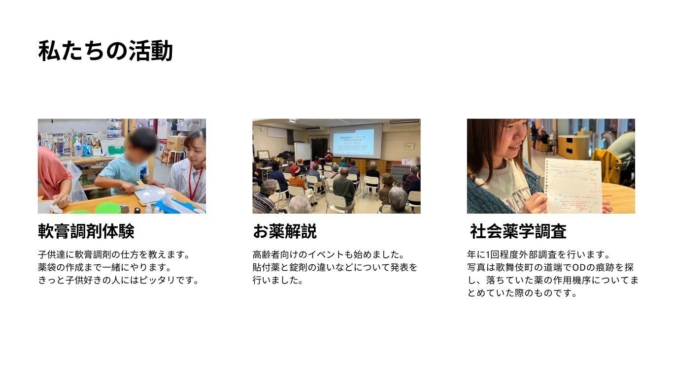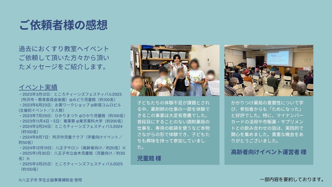 2022年からは、児童館や地域イベントでの子ども向け薬剤師体験、高齢者向けのお薬講座などを展開し、徐々に活動の幅を広げてきました。