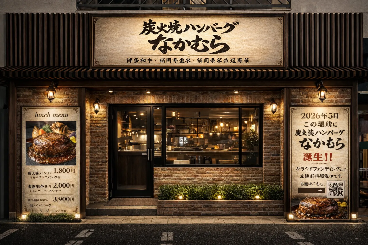 2026年5月、福岡県春日市に五感で楽しめる”炭火焼ハンバーグ専門店”を開業したい! 九州の恵み・素晴らしい食材で作るハンバーグを、お腹いっぱい食べて頂きたい。 ”肉・野菜・米・卵”各素材の力を最大限に引きだす事にこだわり 炭火で仕上げる最高の1皿のハンバーグを日本の国民食にしたいです!