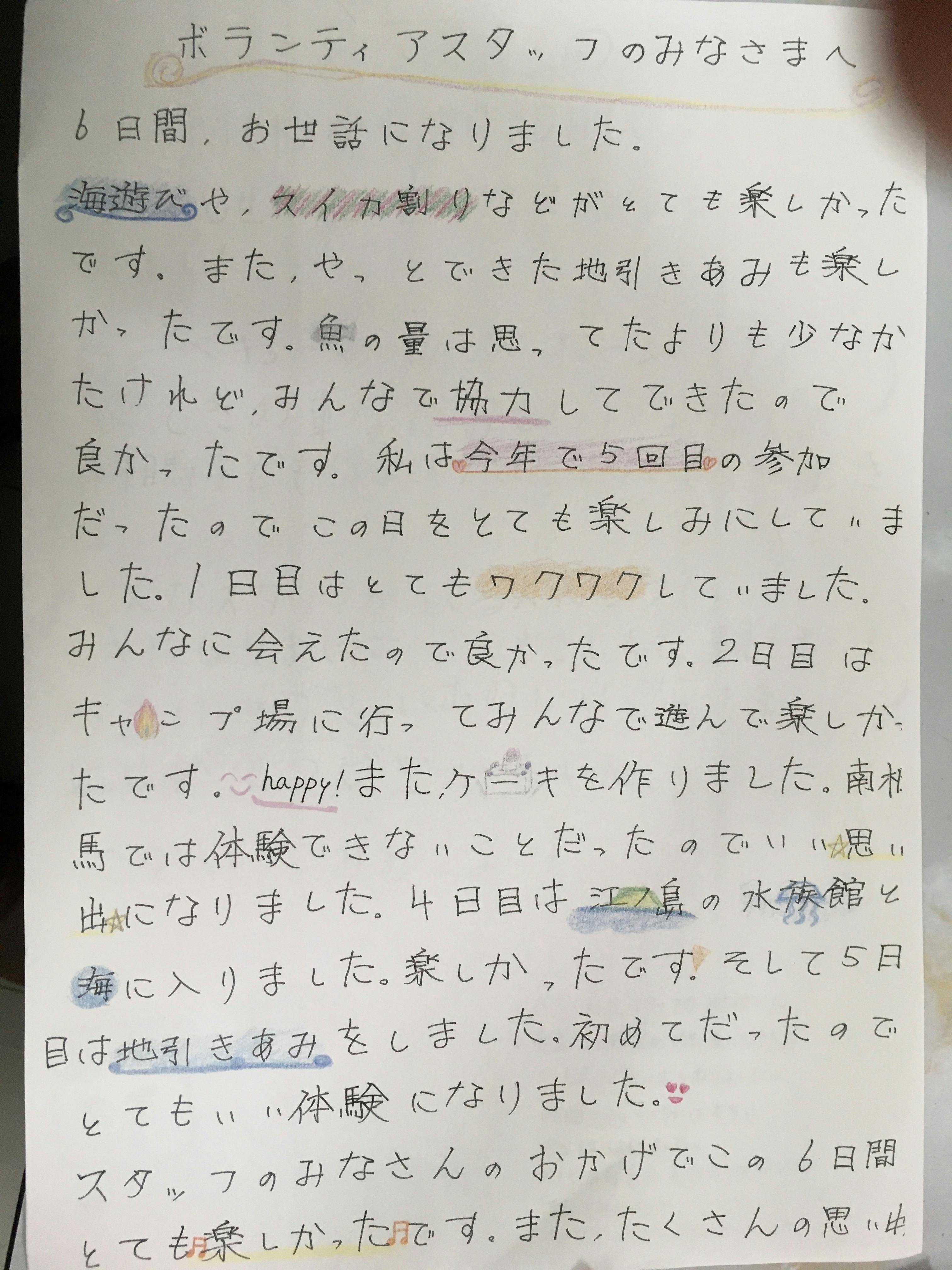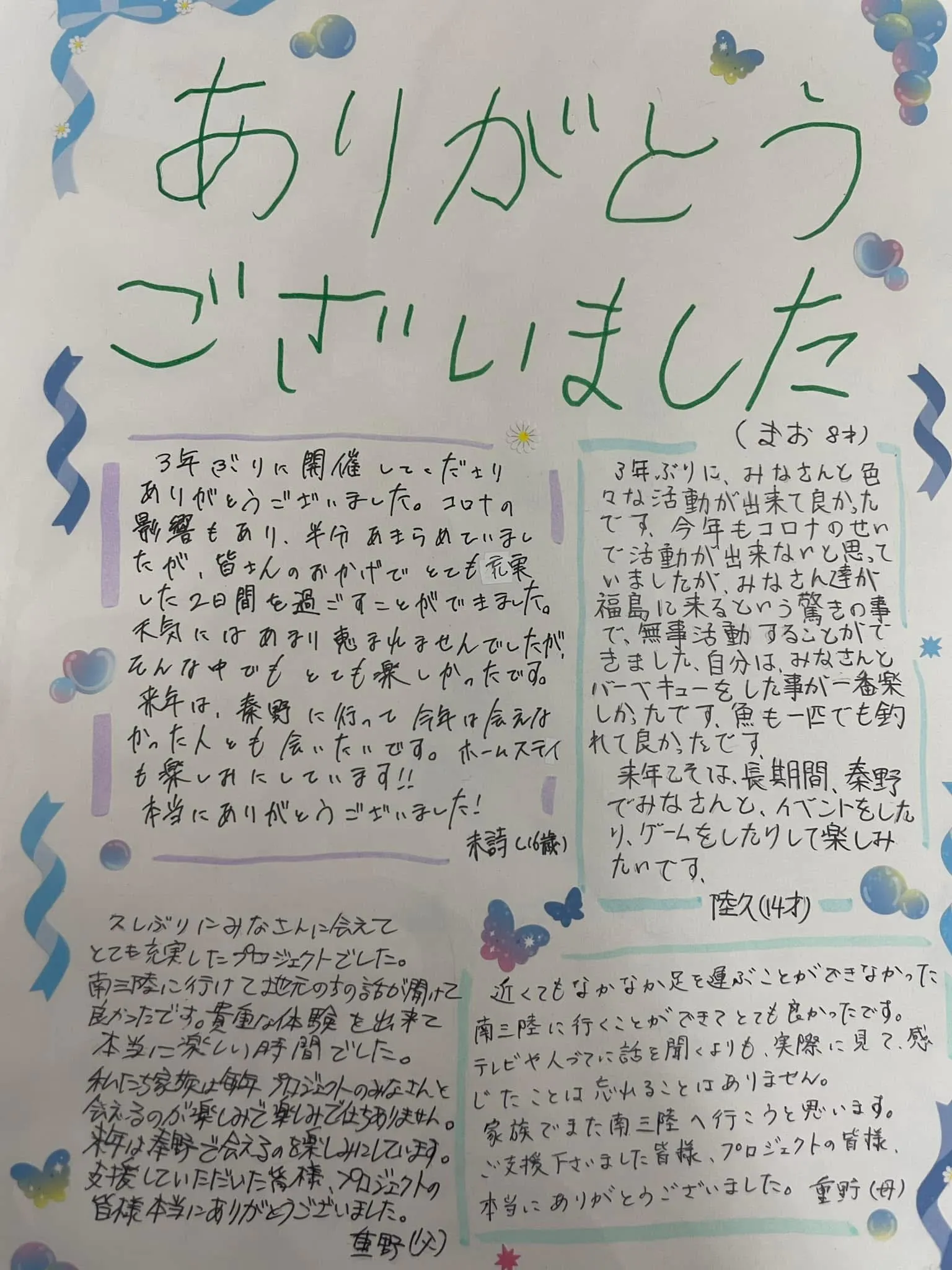 またご参加された南相馬市の子どもたちからのサンキューレターをお届けします。