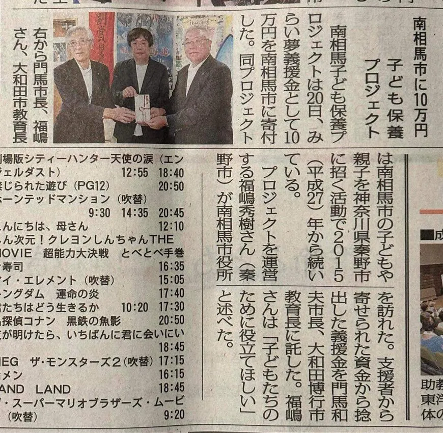 このプロジェクトは往復新幹線や滞在費などは募金活動や周囲の方たちからのご協賛により今まで神奈川県へ8回ご招待。「海」と「山」で遊ぶことをテーマにしたこの活動は過去、神奈川県秦野市や福島県南相馬市の教育委員会の後援を受けたこともあり、両市長のご理解をいただき活動させていただきました。2015年以来、南相馬市へ寄付させていただいております。