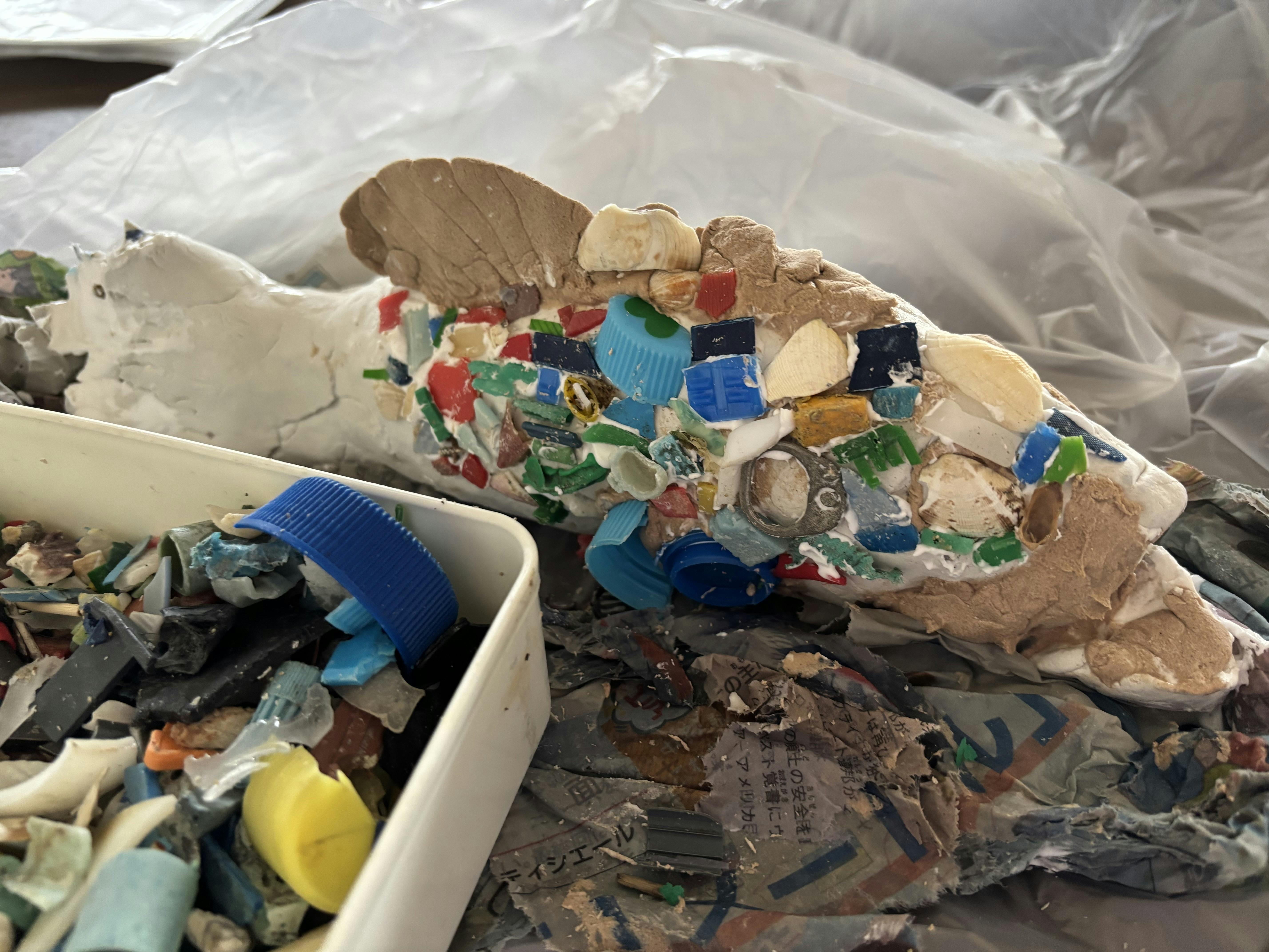 外来種であるブラックバスには、海洋プラスチックゴミを色とりどりに貼り合わせます。