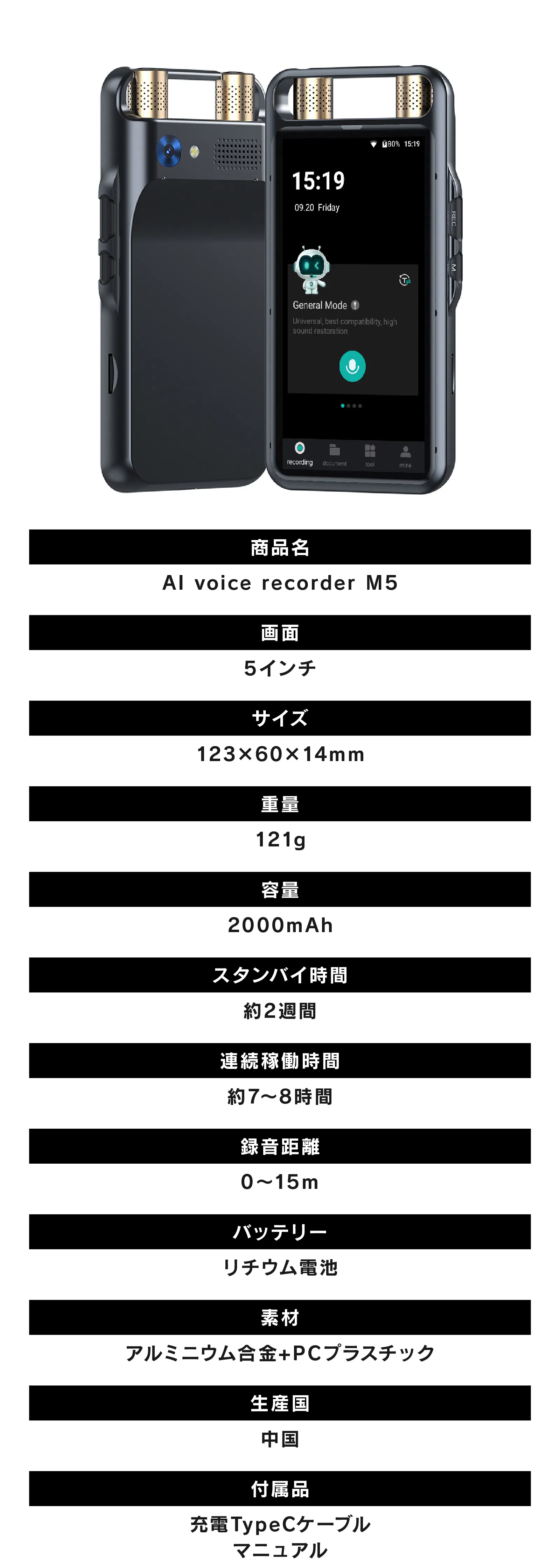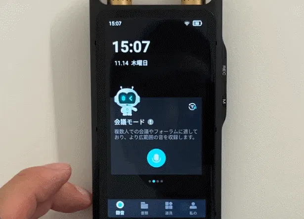 【AI voice recorder M5】は15m先の音声をしっかり拾える、高性能マイクとAI機能を搭載したボイスレコーダーです。