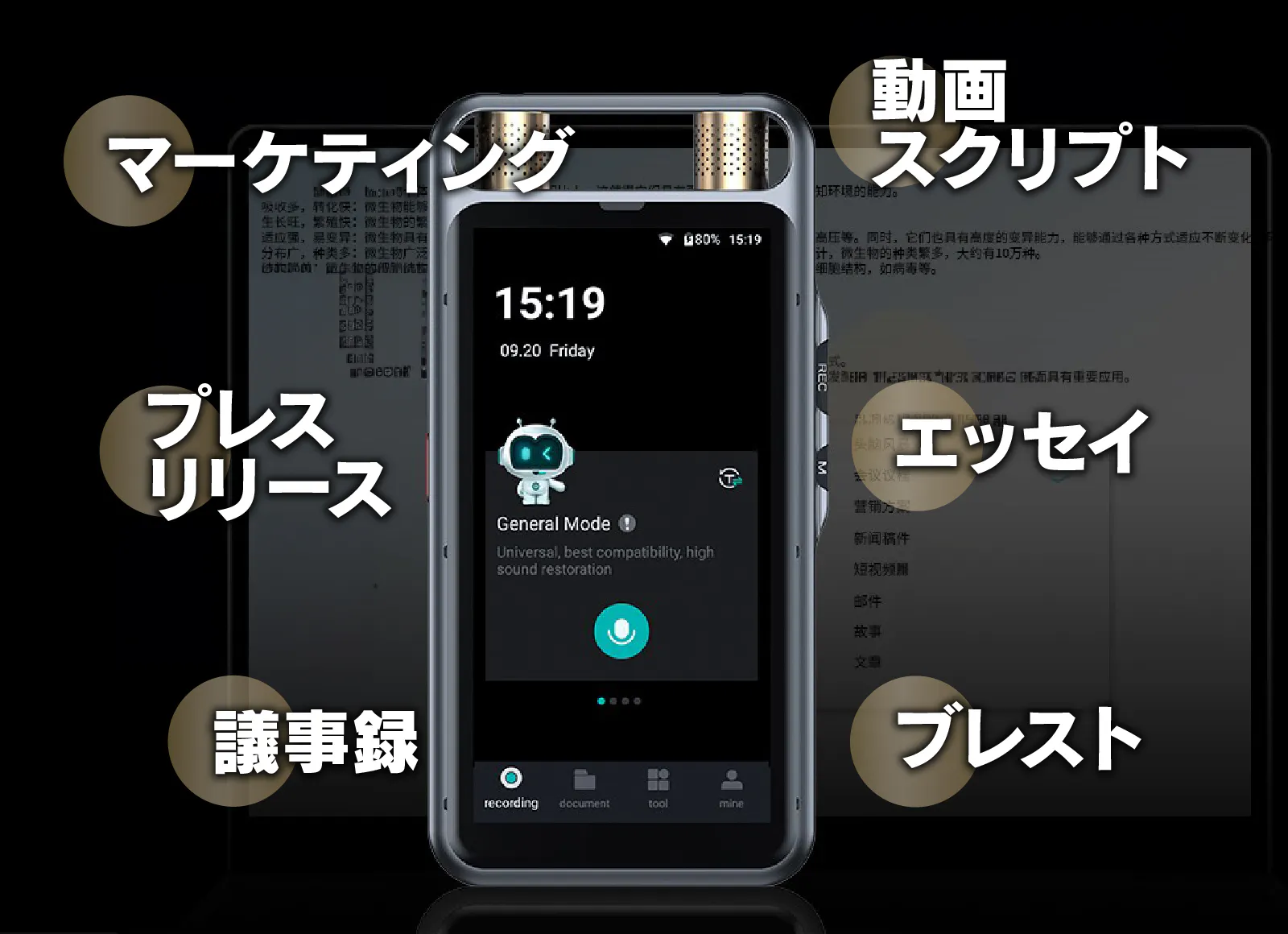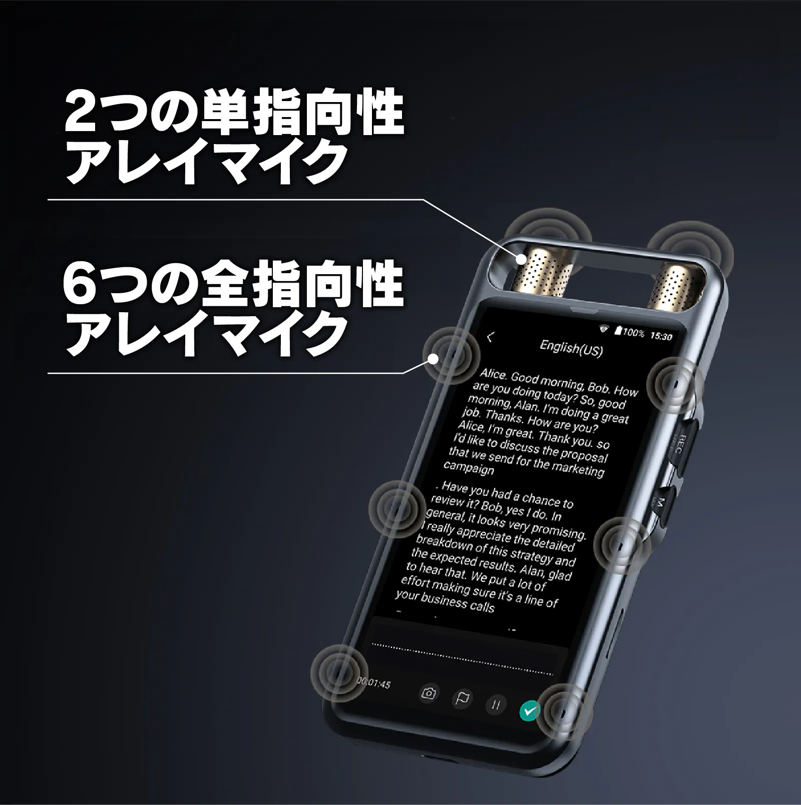 8つのマイクを搭載しクリアな音声を録音するばかりではなく、AIにより音声の同時テキスト化、さらにはテキストの要約まで行えます。