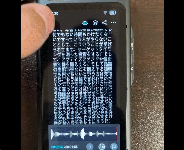 【AI voice recorder M5】はテキスト化したい言語を指定すると、録音しながら文字起こしをしてくれます。日本語なら約98%の精度でテキスト化します。