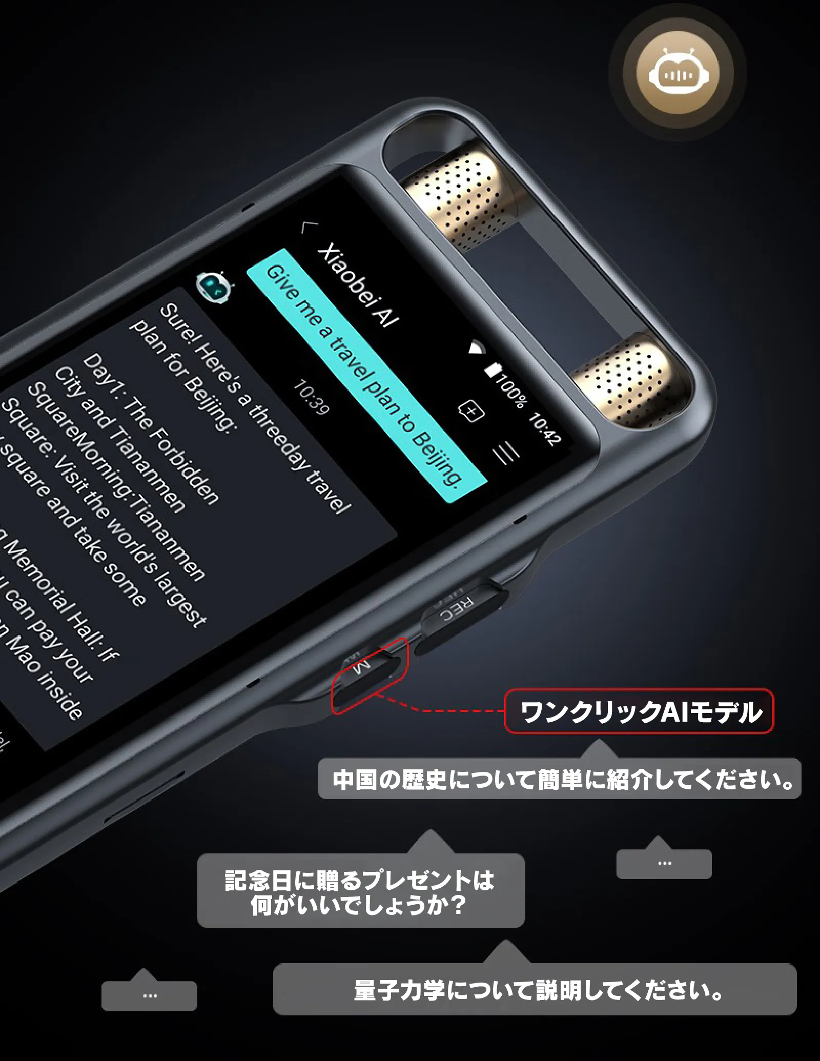 【AI voice recorder M5】はインターネットに接続することで「Chat GPT 4.0」をベースに、独自開発のAI「Xiaobei AI」と連携させ、様々なAI機能を1日3回まで無料で使えます。※