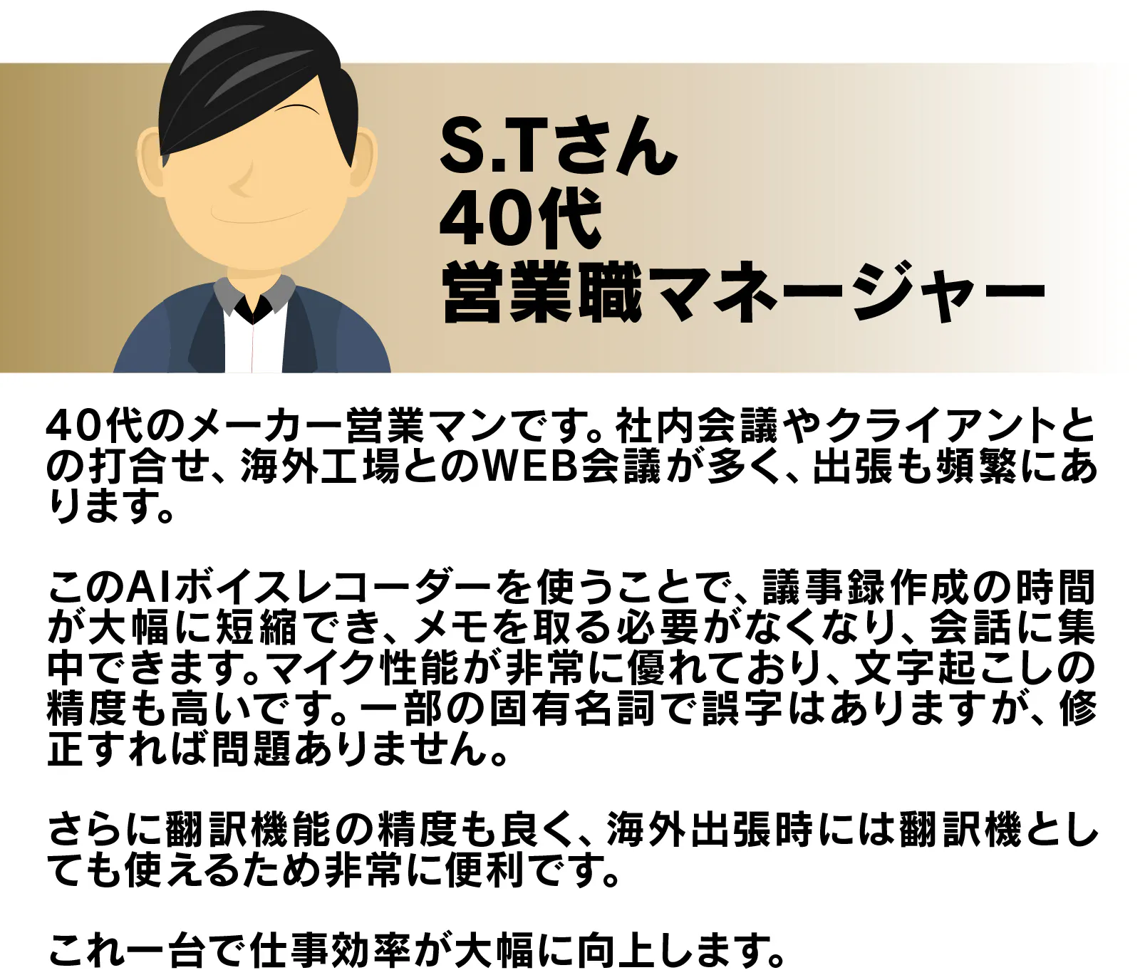 また、海外出張や多言語での打ち合わせも多い中、このデバイスは多言語対応で、プロフェッショナルな翻訳機としても活用でき、これ一台でグローバルな仕事が可能です。