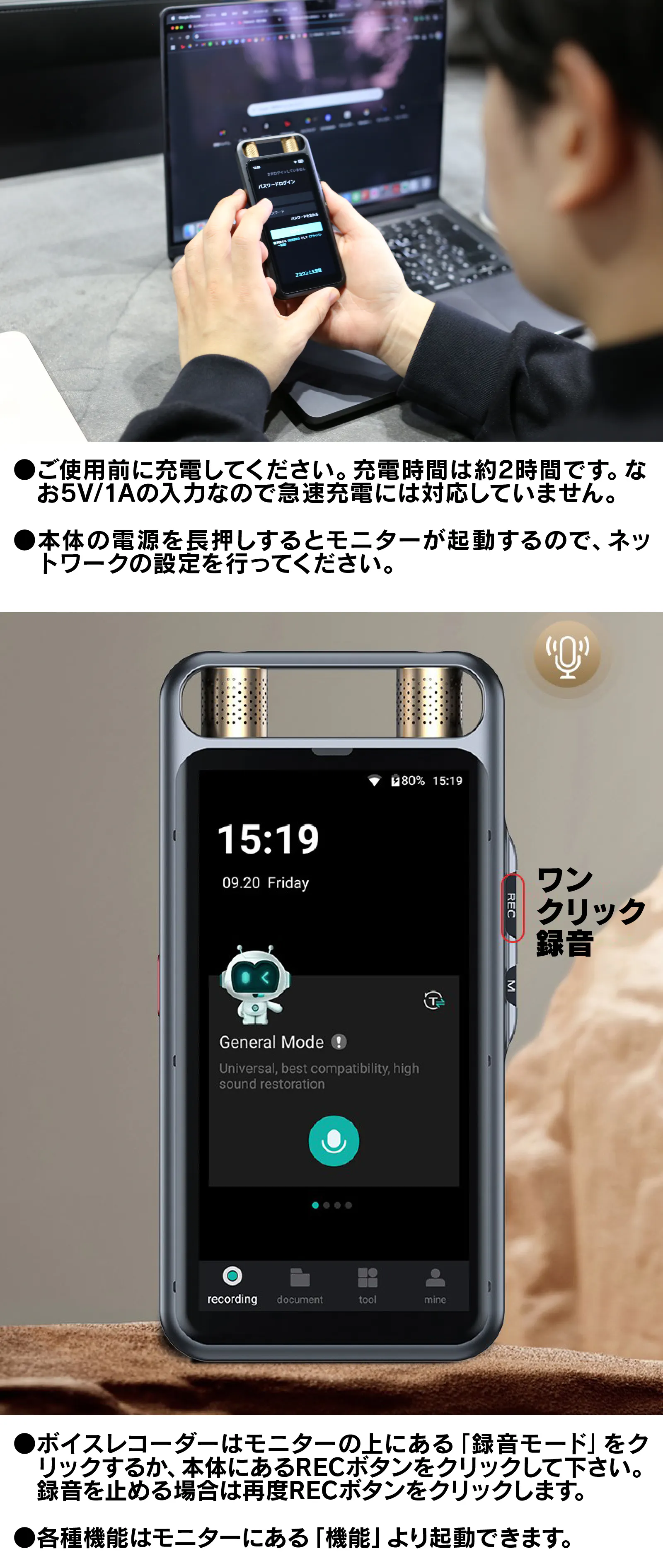 【AI voice recorder M5】は充電式で2000mAhのリチウムイオンバッテリーを搭載しています。