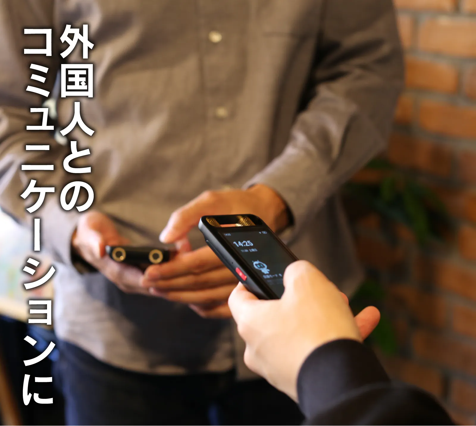 外国人とのコミュニケーションで相手の言語をマイクで拾い、翻訳してスピーカーから音声で出力されます。