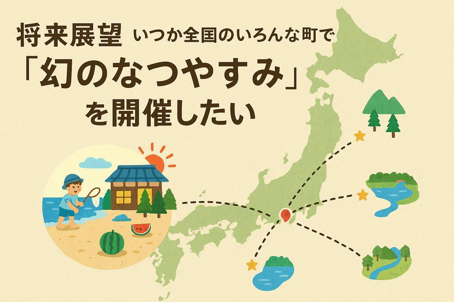 いつか本当に、全国のいろんな町で“幻のなつやすみ”を開催していけたらと思っています。 たとえば、千葉の海辺から、長野の山へ。広島の島で、福井の川辺で。