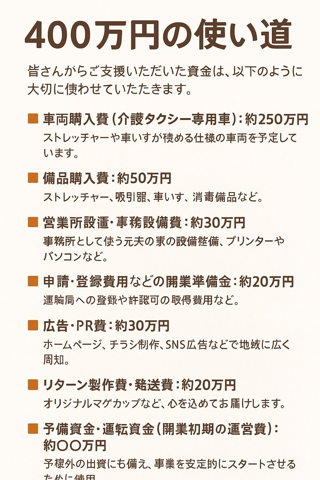 このプロジェクトを通じて、多くの方々の生活がより豊かになることを心から願っています。皆様のご支援があれば、介護タクシー事業を成功させ、地域社会に貢献することができると信じています。どうか、私たちの挑戦を応援していただきますよう、よろしくお願い申し上げます。皆様の温かいご支援を心よりお待ちしております。