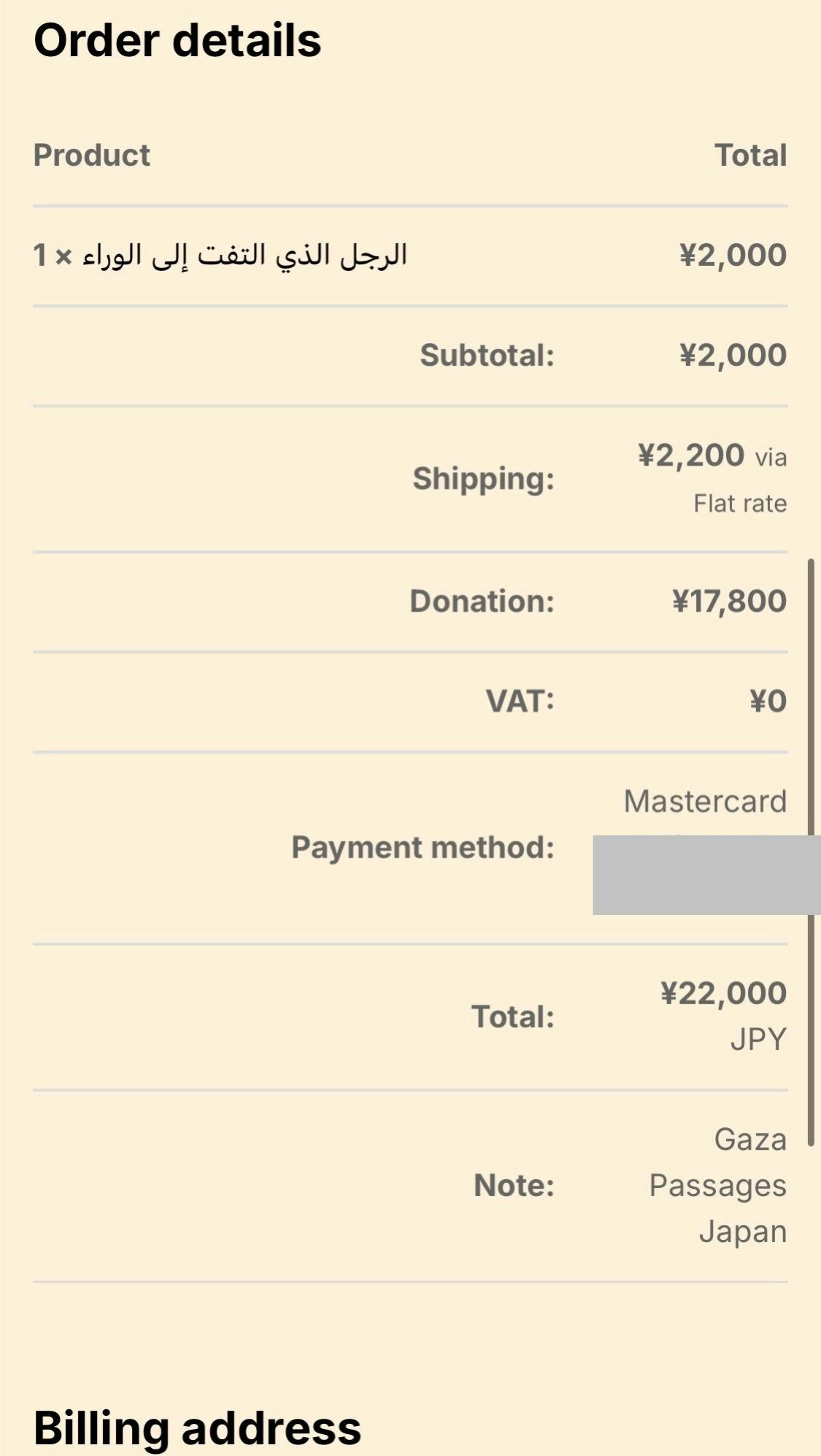 また、文学フリマ東京40の売り上げの内、『戦時下にて』20冊分の売上40,000万円分(271USドル)をヒンド・ジューダさんに送金しました。