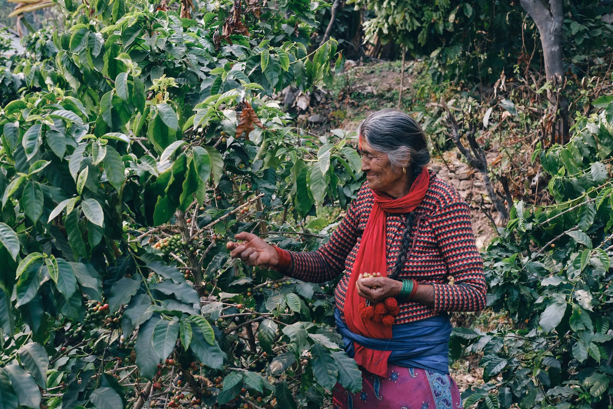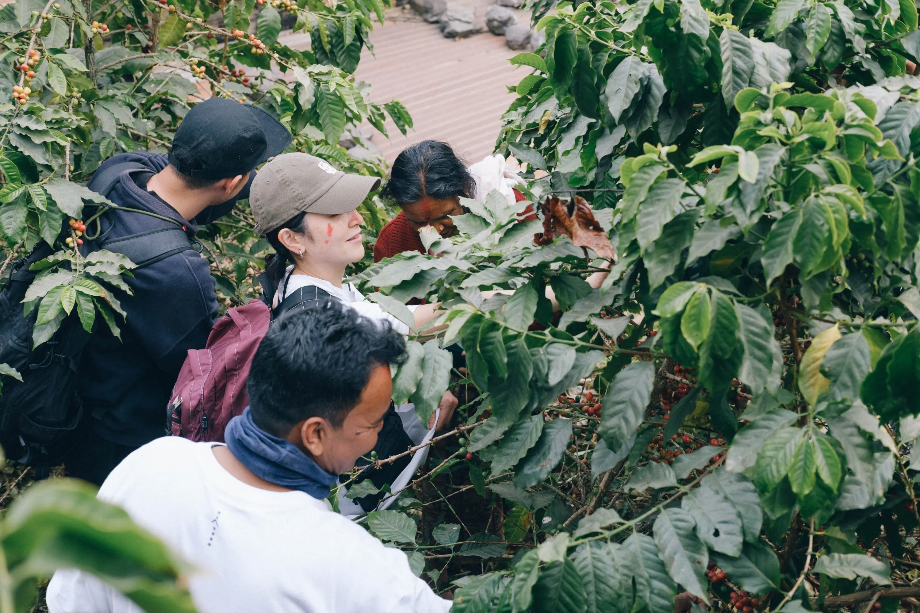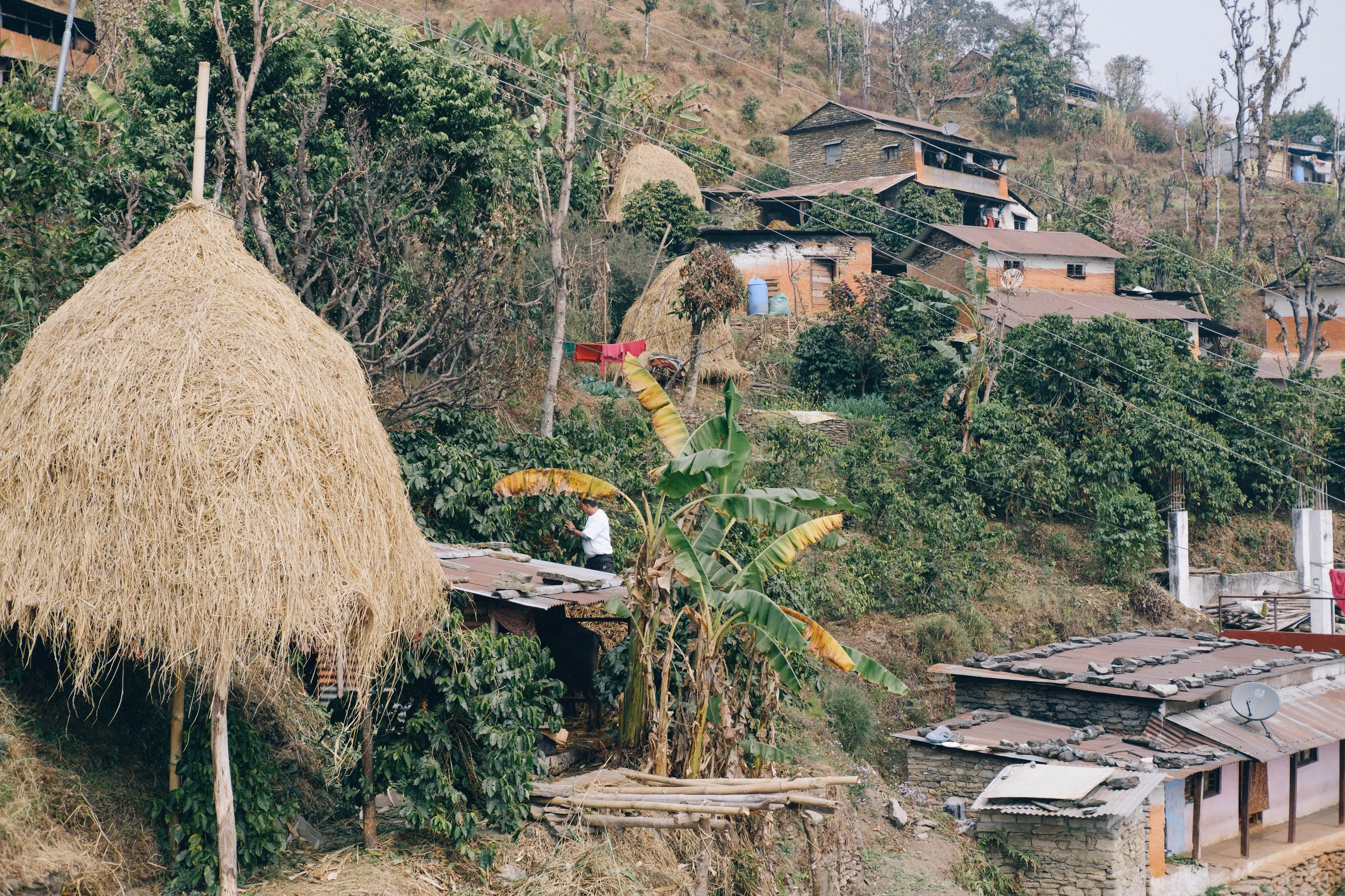 一方、私たちがコーヒーを仕入れているネパール・ハルパン村では、その風景はまったく異なります。この村では、コーヒーの木は庭先の畑に野菜や果物と一緒に植えられたり、森の中や果樹の木陰に植えられたりしています。