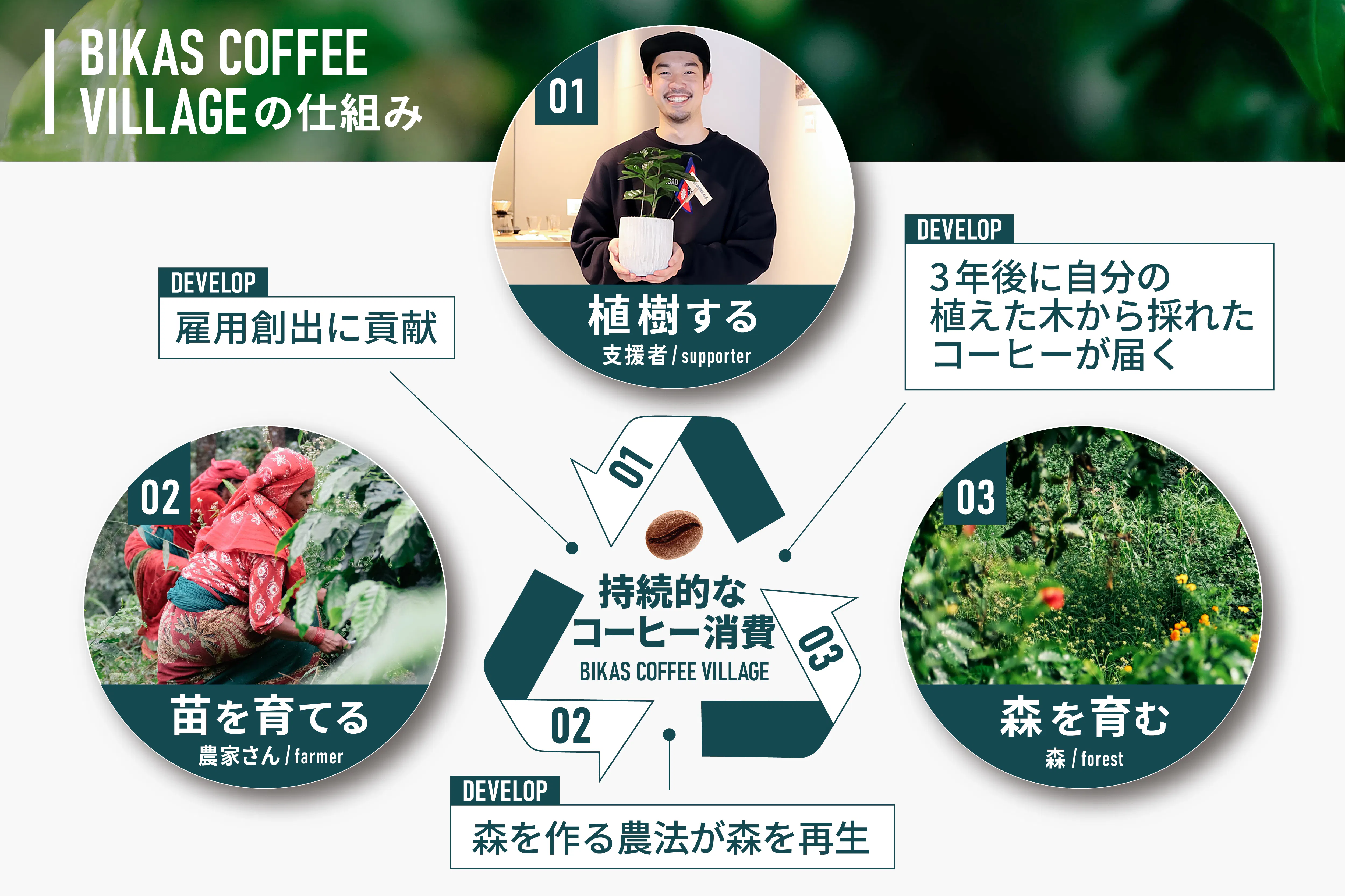 コーヒーの木が実をつけるまでには約3年かかります。私たちはその3年を、植樹する方ご自身が「どのように過ごしたいか」「3年後、どんな自分でありたいか」を考える時間として捉えています。みなさまの想いは農家に届けられ、手をかけて育てられた木はやがて実を結び、3年後にコーヒーとなってみなさまのもとへ返ってきます。