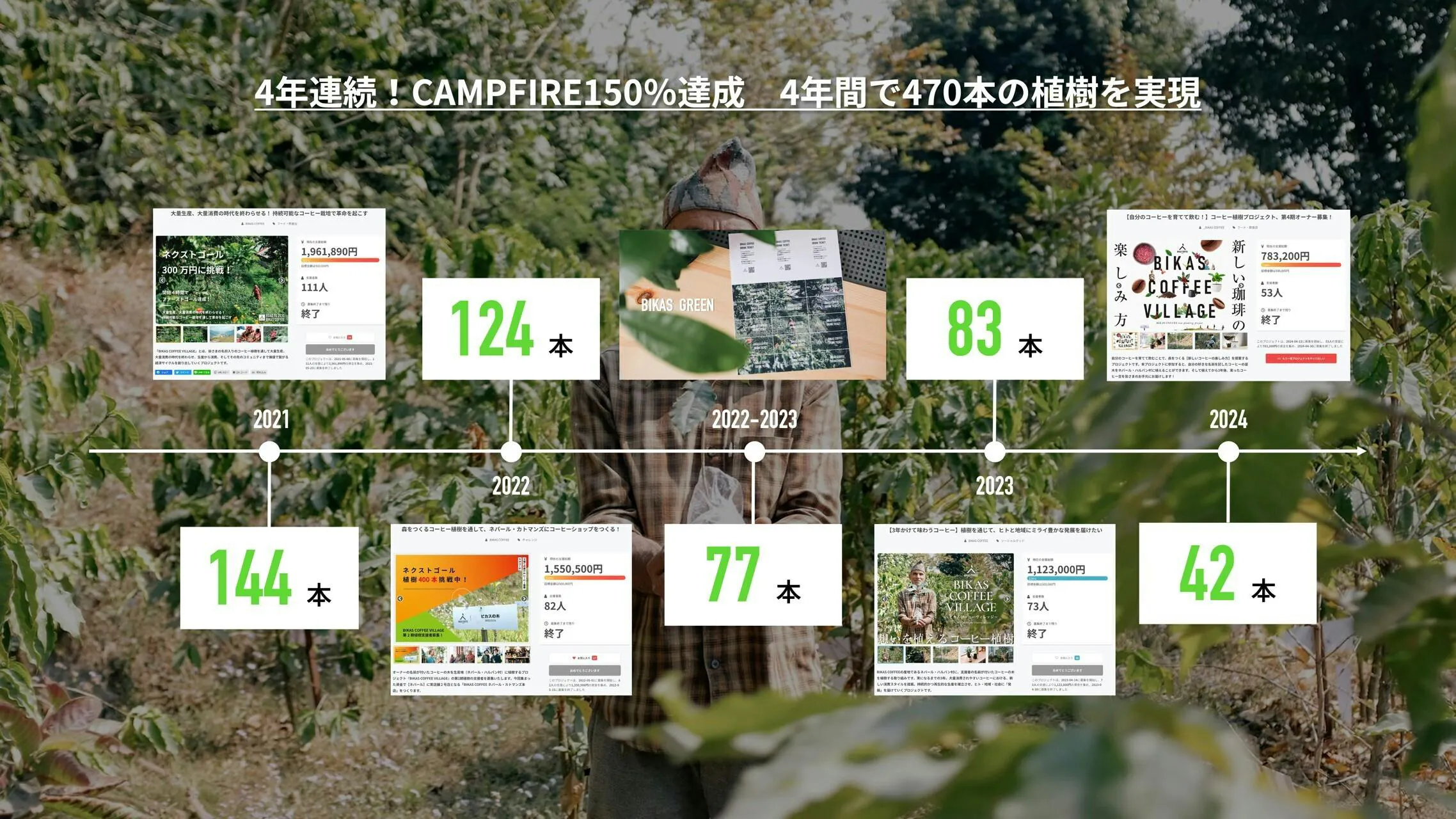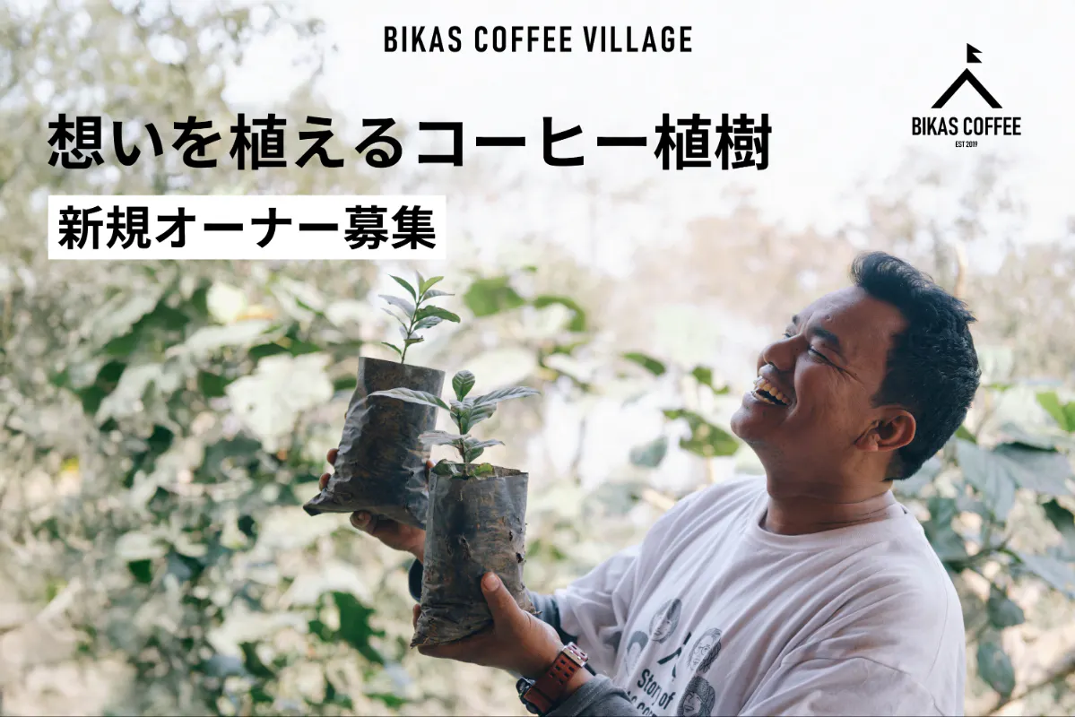 今回のプロジェクトは、ネパールの生産地に支援者の好きな名前を記したコーヒーの苗木を植える『BIKAS COFFEE VILLAGE』第5期の募集となります。2021年から4期連続で目標達成を実現し、これまでに累計470本の苗木を植樹してきました。2024年には、第1期で植えた木から初めての収穫があり、植樹オーナーの皆さまへコーヒーをお届けすることができました。