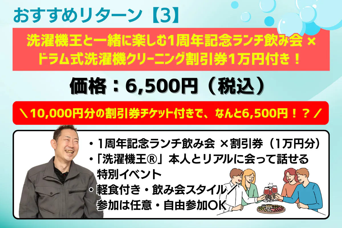 A.はい!ランチ飲み会・ディナー飲み会など、「洗濯機王®」本人とリアルに会って話せる特別イベントをご用意しています。
