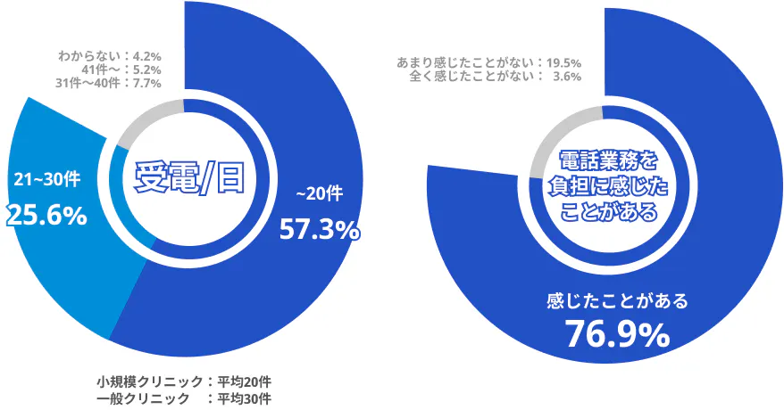 一般的なクリニックで平均30件/日の電話を着信しており、内、1/3が営業電話、1/3が予約や場所、休診などの確認でウェブでも対応でき、必ずしも電話である必要のないものが占めています。