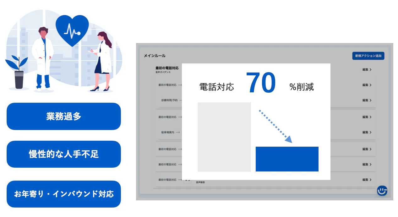メディコルはβ版リリース後、テスト導入いただいたクリニックで最大受電件数70%削減を実現。