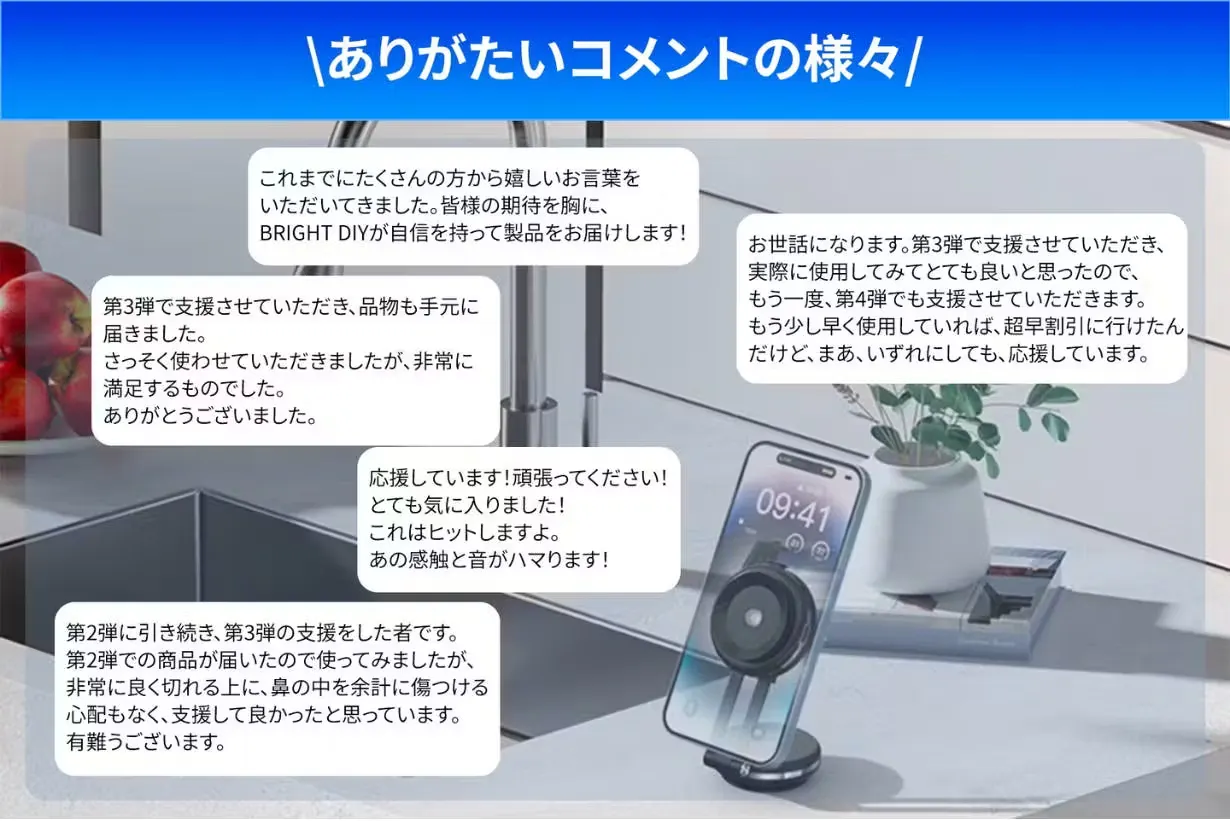 2026/04/07 08:00みなさん、こんにちは。BRIGHT DIYです。本日は皆さまに新しいプロジェクトを紹介させて頂きます。最大41%OFF!!!真空吸着で平滑面に強力固定、跡も残さず安心使用!さらにワイヤレス充電対応で、スマホを置くだけで充電可能。コンパクトに折りたためて持ち運びも便利!スマホやタブレットの使い勝手がさらに快適に!プロジェクト概要キャンペーン期間 2026年4月7日〜2026年5月31日プラットフォーム CAMPFIREキャンペーンURL https://camp-fire.jp/projects/911828/view※プロジェクト公開後から閲覧可能になります。2026年4月7日 8時からプロジェクト公開となります。数に限りがございますので、早い者勝ちです!!!1点の早期リターンの場合先着35名様限定で37%OFFになります!※早期リターンは在庫がなくなり次第終了となります。プレゼントキャンペーン付きプロジェクトを実施します! もっと見る