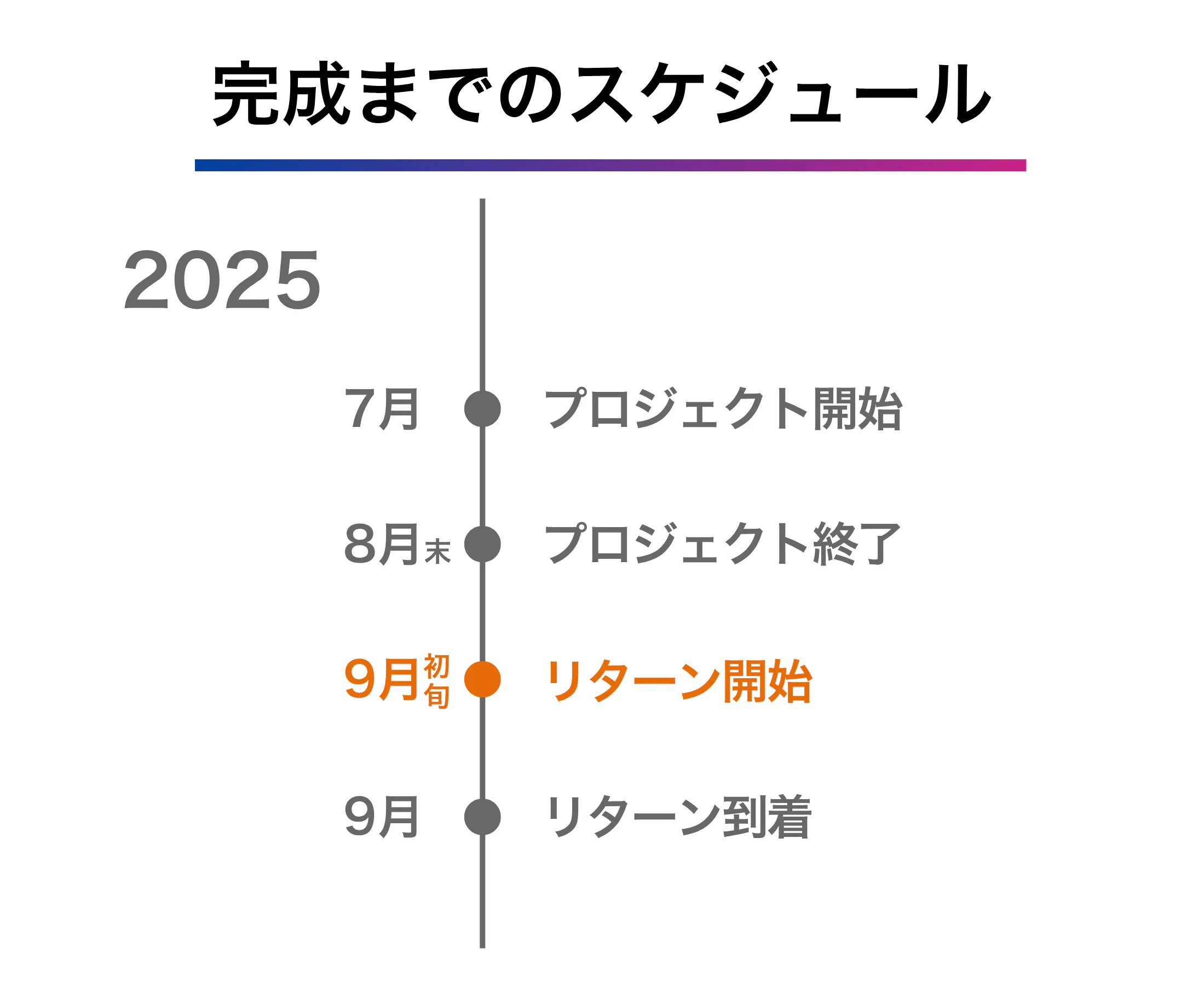 ※本文中に記載させていただいたスケジュールは、あくまでプロジェクト公開時点の予定です。クラウドファンディングの性質上、配送遅延のおそれがございます。