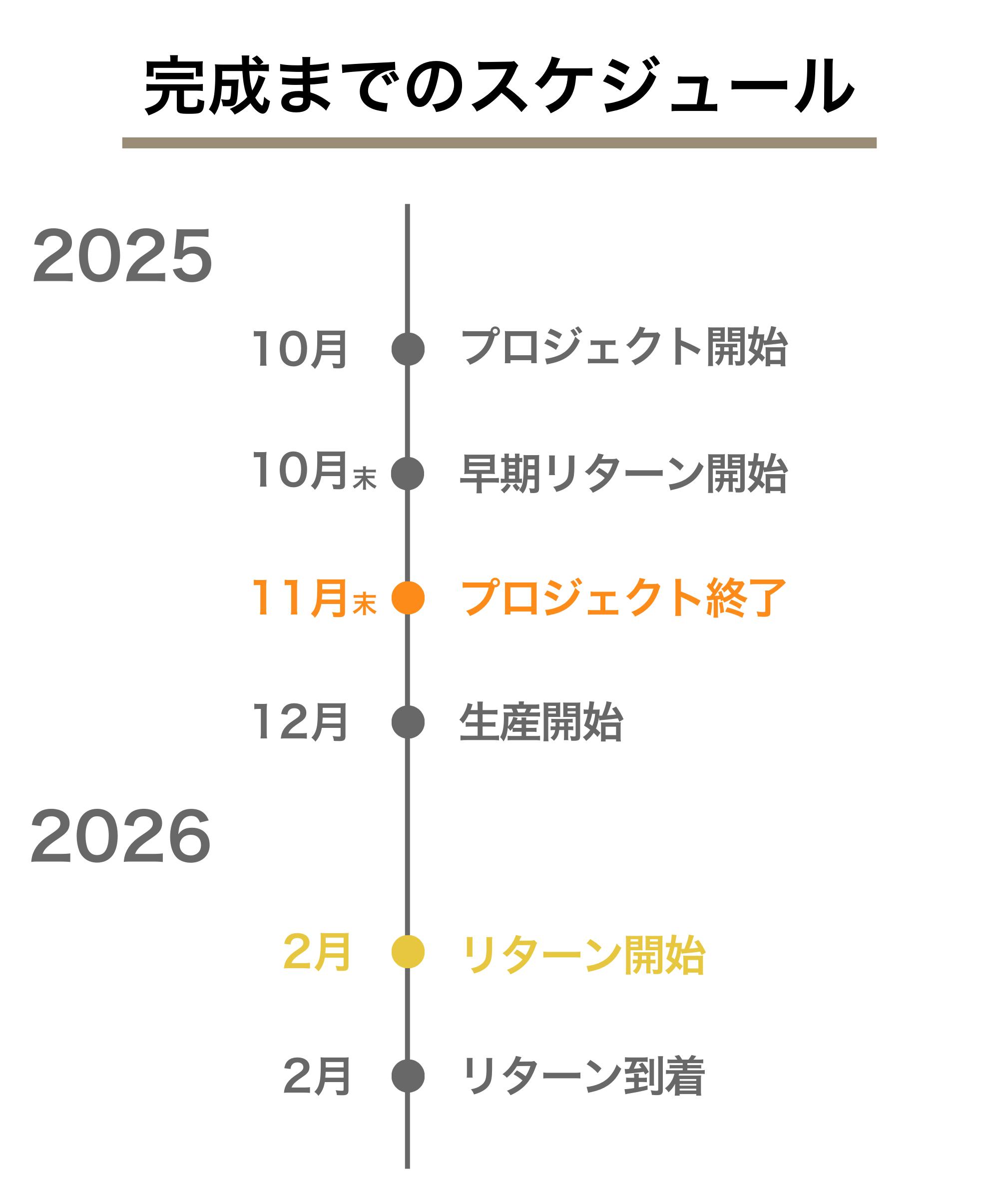 ※本文中に記載させていただいたスケジュールは、あくまでプロジェクト公開時点の予定です。クラウドファンディングを経て輸入を行う性質上、配送遅延のおそれがございます。