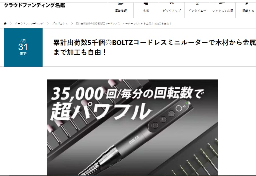 皆様、こんばんは!Brightチームです。先日、クラウドファンディング名鑑で「BOLTZ + Bench Top 第5弾」を紹介して頂きました。話題:累計出荷数5千個◎BOLTZコードレスミニルーターで木材から金属まで加工も自由!興味がある方、是非下記のリンクからアクセスしてみてください。https://crowdfunding.meikan.org/project/campfire-848311/【レビューの一部抜粋】〈多機能で高精度なコードレスミニルーター「BOLTZ」DIY愛好家やプロのものづくりに最適なコードレスミニルーター「BOLTZ」がクラウドファンディングで登場しました。最大35000回転の高速回転に対応し、プラスチックや木材、金属など幅広い素材に対応可能です。特に「ツインベアリング」技術により、軸のブレを抑え、正確な穴あけや彫刻が実現できる点が大きな特徴です。軽量かつコンパクトな設計で、持ち運びやすく作業中の疲労も軽減されます。使いやすさを追求したデザインと機能性BOLTZは電動工具のプロフェッショナルチームが開発し、使いやすさを徹底的に考慮したデザインが魅力です。スイッチやボタンは一直線に配置され、モード切替がスムーズに行えます。さらに、LEDディスプレイで回転速度などの設定が一目で確認できるため、作業効率が向上します。工具ビットは磁力でしっかり固定される専用収納ボックスに収まり、整理整頓も簡単です。USB Type-C充電に対応し、約40分の充電で2~3時間の連続使用が可能です。幅広い用途に対応しDIYをサポートBOLTZは初心者からプロまで幅広いユーザーに対応できる多機能ツールです。ドリルや研磨、彫刻など多彩な作業に対応し、工具ビットも一般的な2.2mmおよび2.35mmに対応しているため、手持ちのビットも活用できます。海外でもUSB充電で使用可能なため、グローバルに活躍できる点も魅力です。今後のDIYライフをより快適にするツールとして注目されています。詳しくはプロジェクトページをご覧ください。〉ご興味のある方はこの機会をお見逃しなく!https://camp-fire.jp/projects/848311/view8月31日まで販売期間は続きますので、ぜひSNSでのシェアや身近な方にもおすすめしていただけると嬉しく思います。#boltz #brightdiyどうぞよろしくお願い致します。BRIGHTチーム