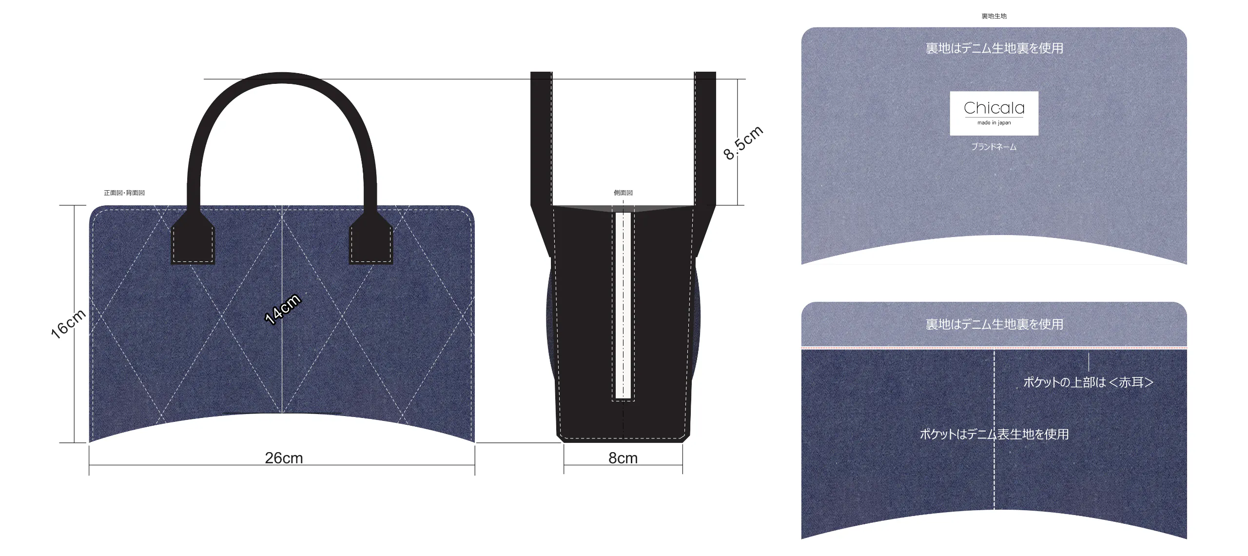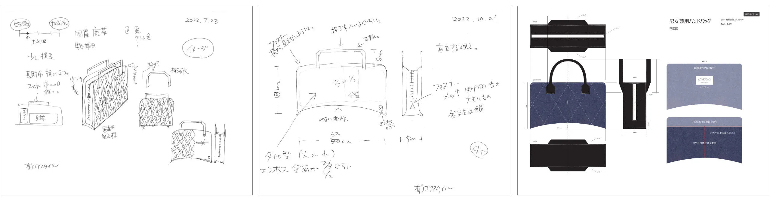 当ブランドデザイナーが、アイデアを描きました。より具現化するため、縫製工場との打ち合わせ資料として簡単な設計図も作成しました。