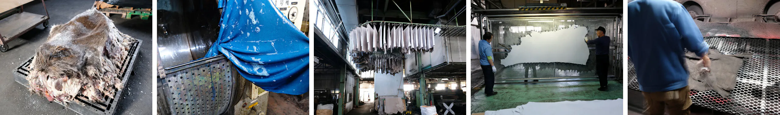 鹿<原皮>を丁寧に鞣して柔軟性・耐久性をもたせた<革>にします。品質管理が行き届いたこの工場では、自社で排水用の<水処理施設(1次、2次)>、<植物由来の薬品>を取り入れて環境にも配慮した取り組みをしています。また、地域経済の活性化にも取り組んでいます。