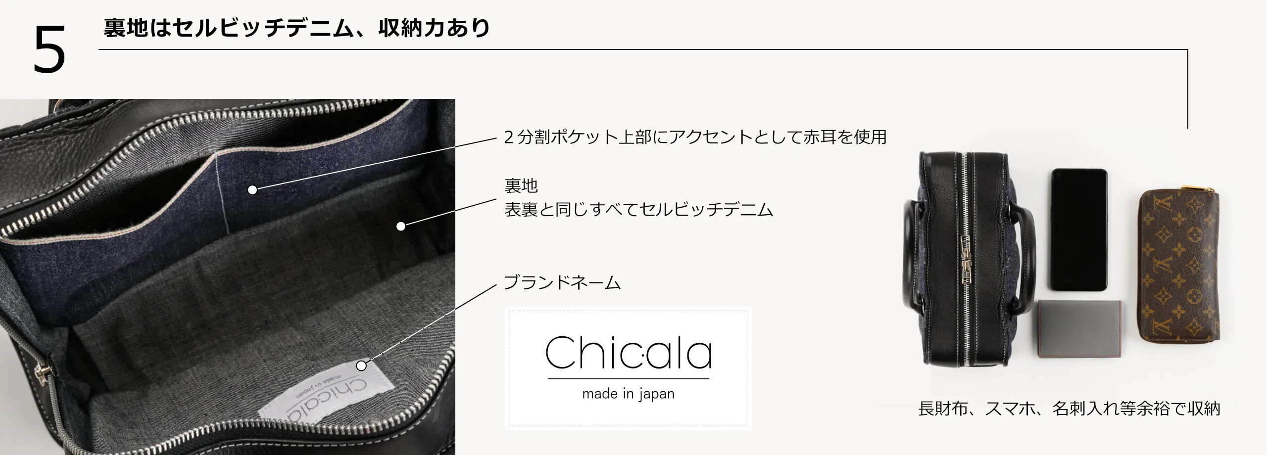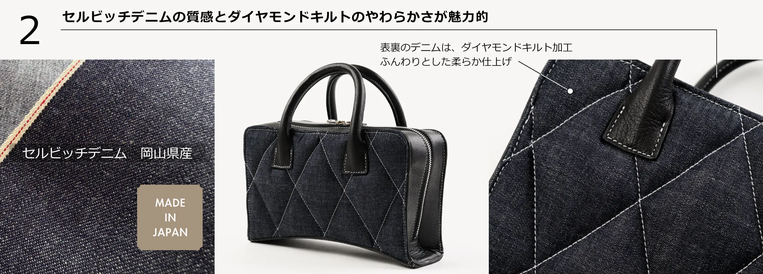 セルビッチデニムは、旧式のシャトル織機で織られた生地で、独特の凹凸感やヴィンテージ風の風合いが特徴です。一方、鹿皮革は非常に柔らかく、しなやかでありながら耐久性も高い素材です。この2つを組み合わせることで、デニムの粗さと革の滑らかさが絶妙なコントラストを生み出します。