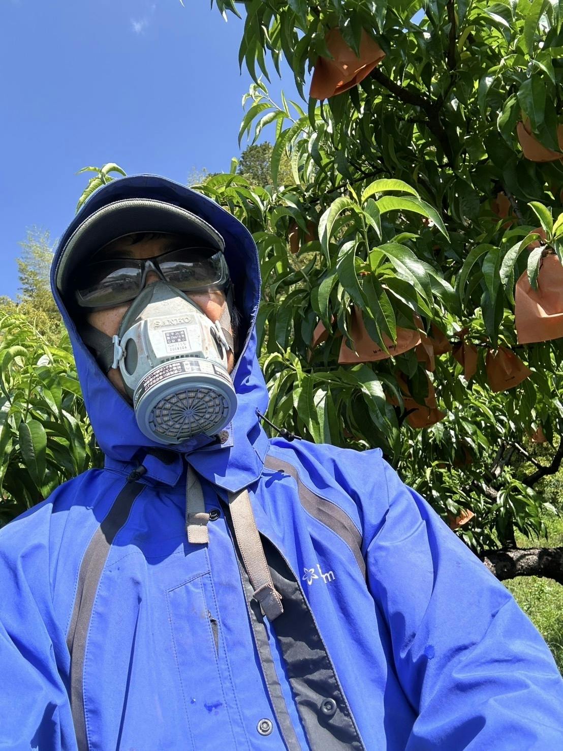 本日は朝から病害予防の作業と、桃への袋掛けを行っています。