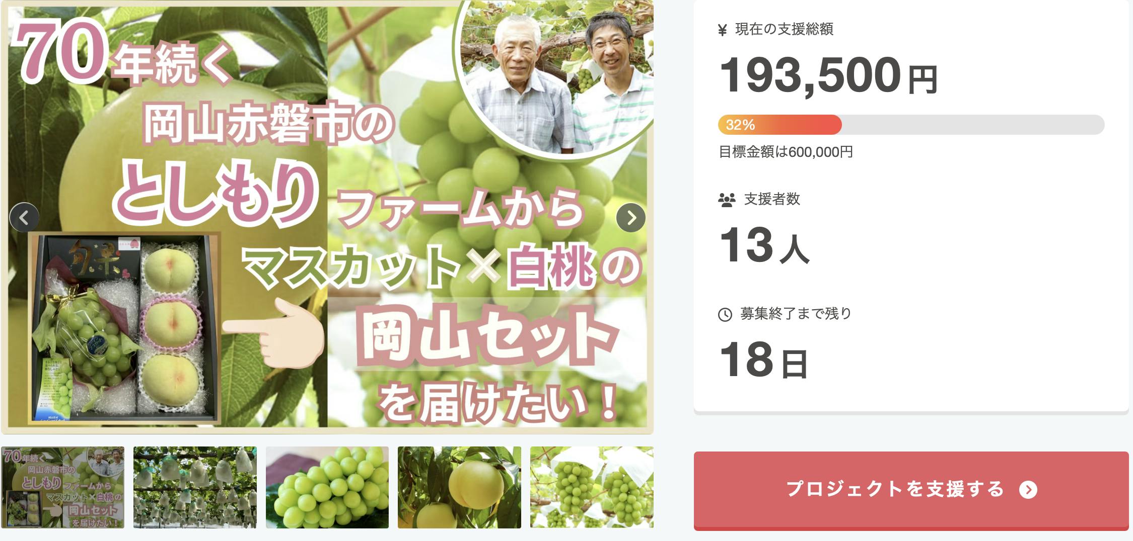 【70年続く岡山赤磐市のとしもりファームからマスカット×白桃の岡山セットを届けたい!】プロジェクト公開から13日が経ちました。