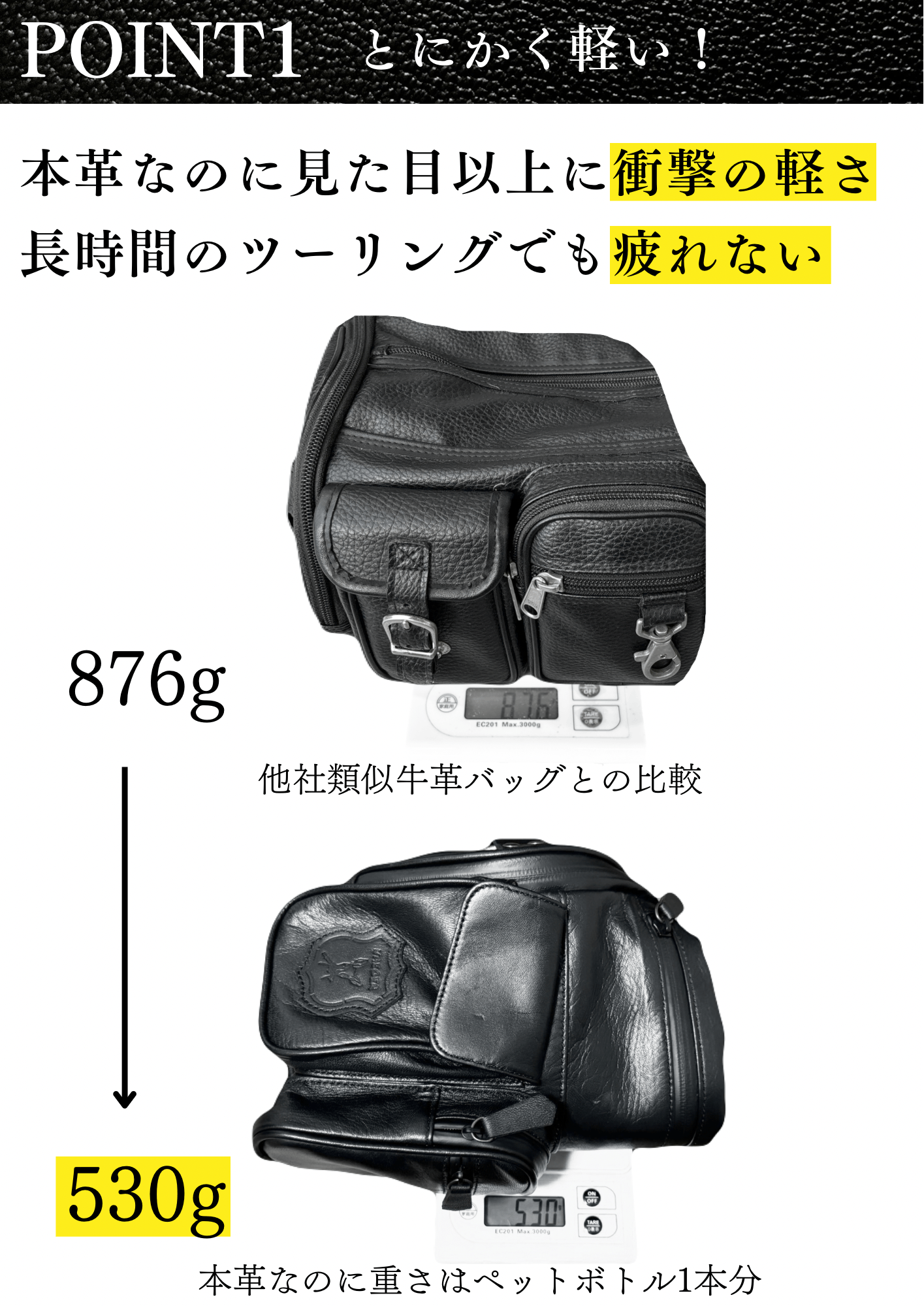 本革ならではの光沢感と重量感のある見た目にも関わらず、鹿革の柔らかく密着する特性により、身体と一体感があり、素材の軽さに加え、とにかく体感が軽いのが特長です。