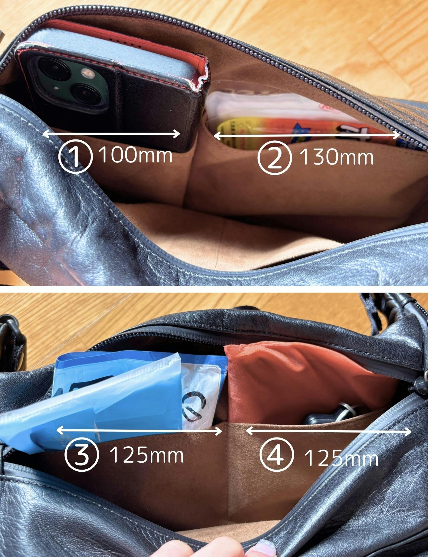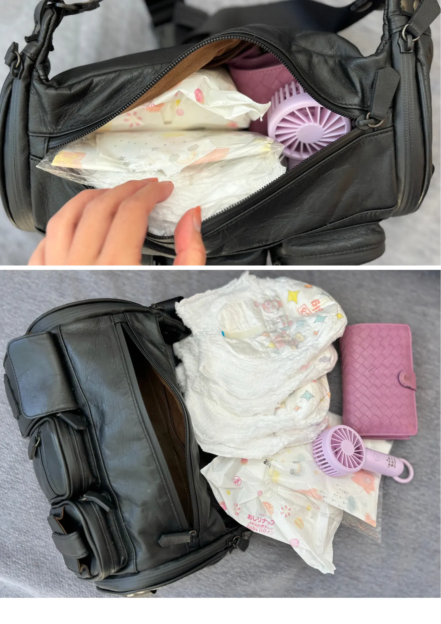 オムツ4枚、お尻拭き、お食事エプロン、ハンディファン、お財布がすっぽり収納でき、化粧ポーチも楽々入ります。