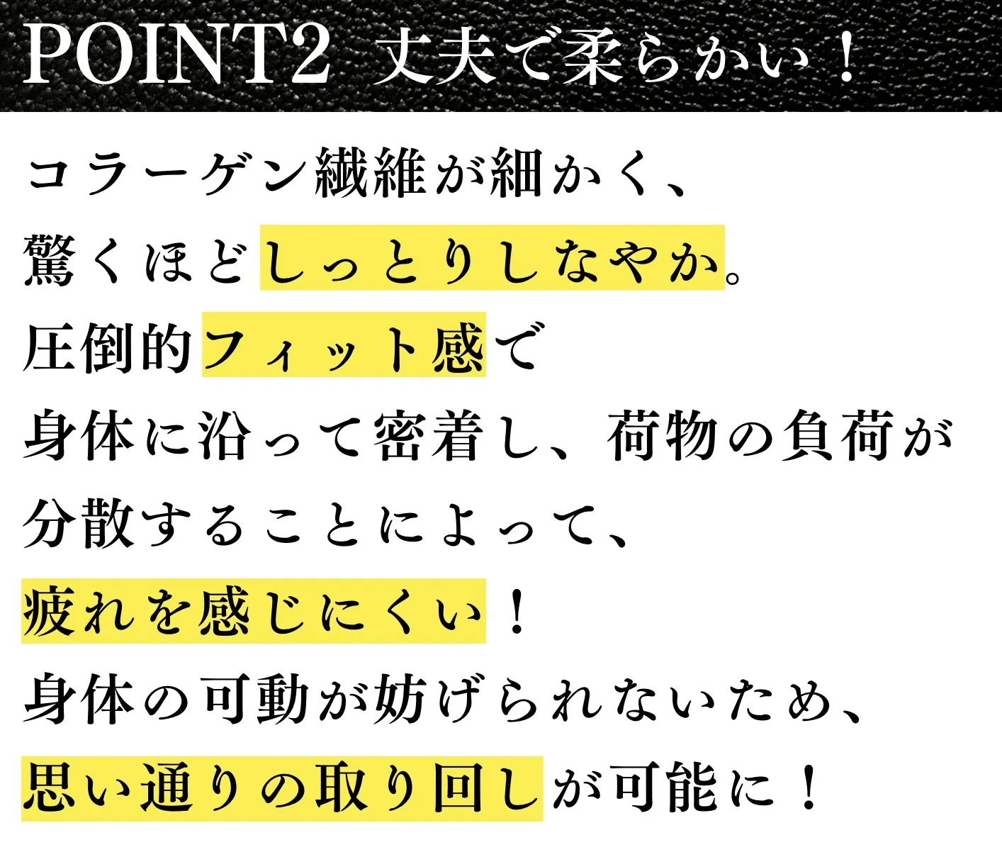 キメが細く、肌触りが滑らかで柔らかい質感を持っています。コラーゲン繊維が細かいため、強靭で柔軟性も高く、形状を保ちながらも身体に自然にフィットし、とても心地よく身につけやすい素材です。