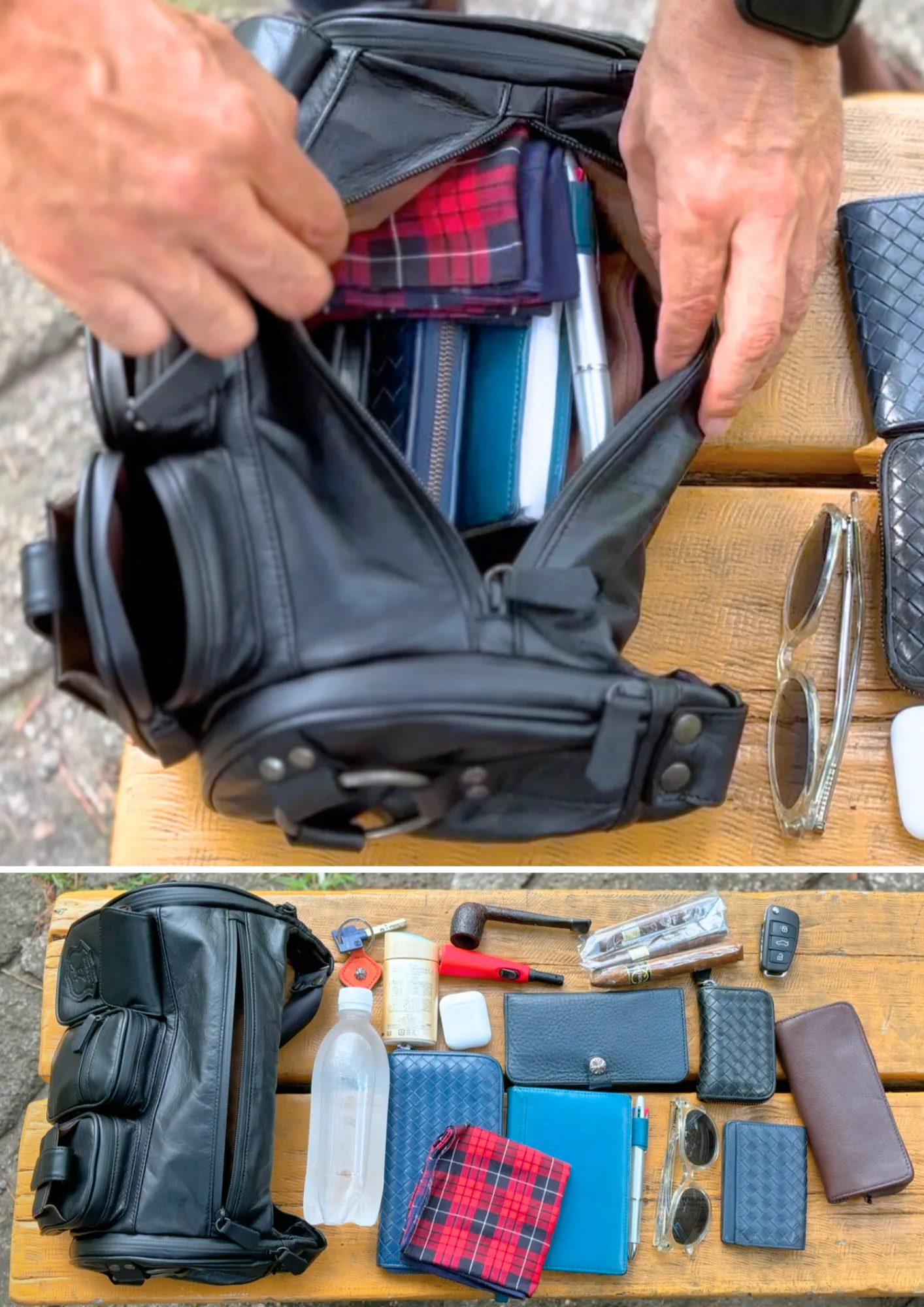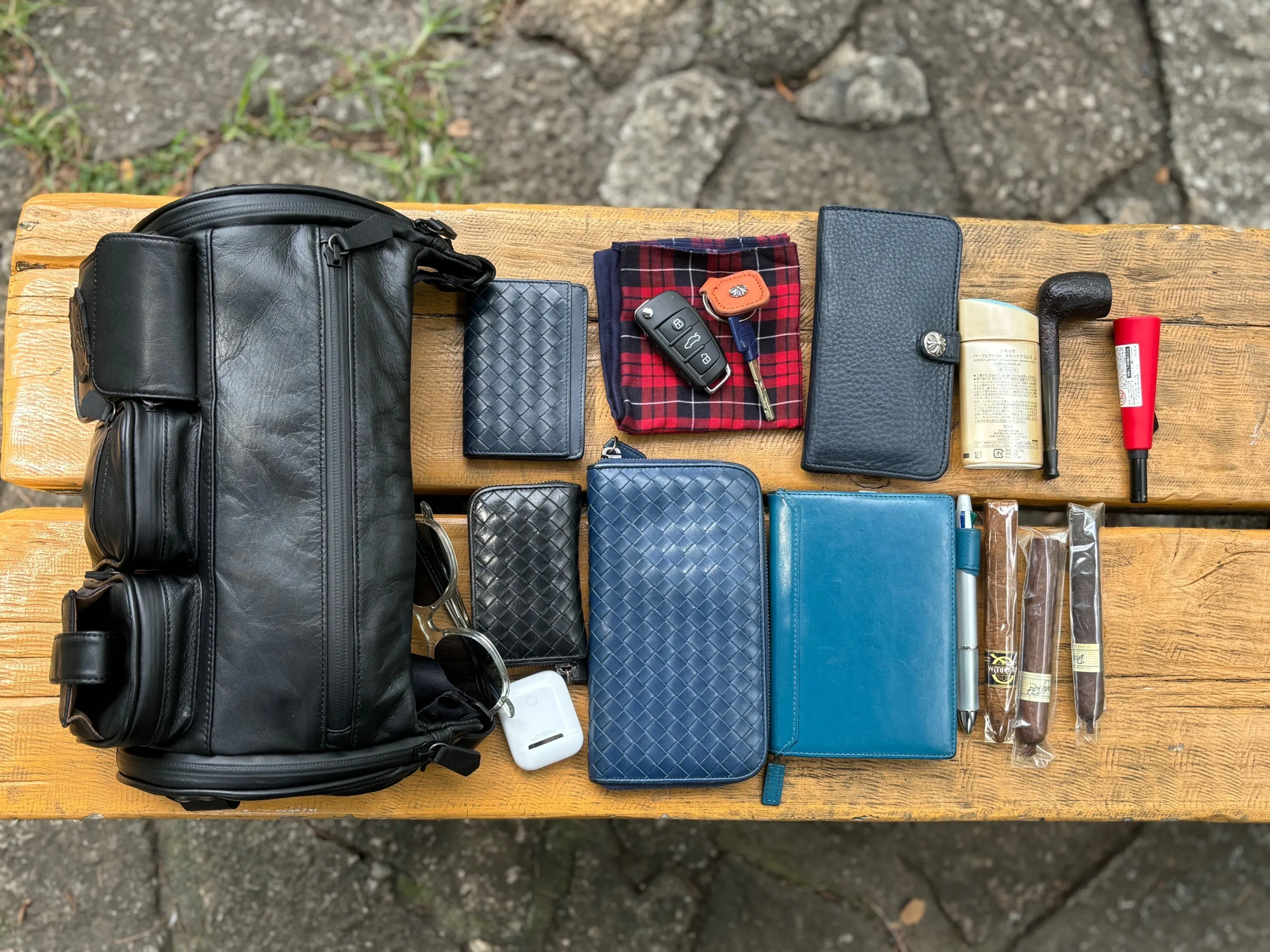 財布、手帳、ペンケース、名刺入れ、小銭入れ、イヤホン、日焼け止め、鍵、葉巻、サングラス、ライター、ハンカチが入ります。