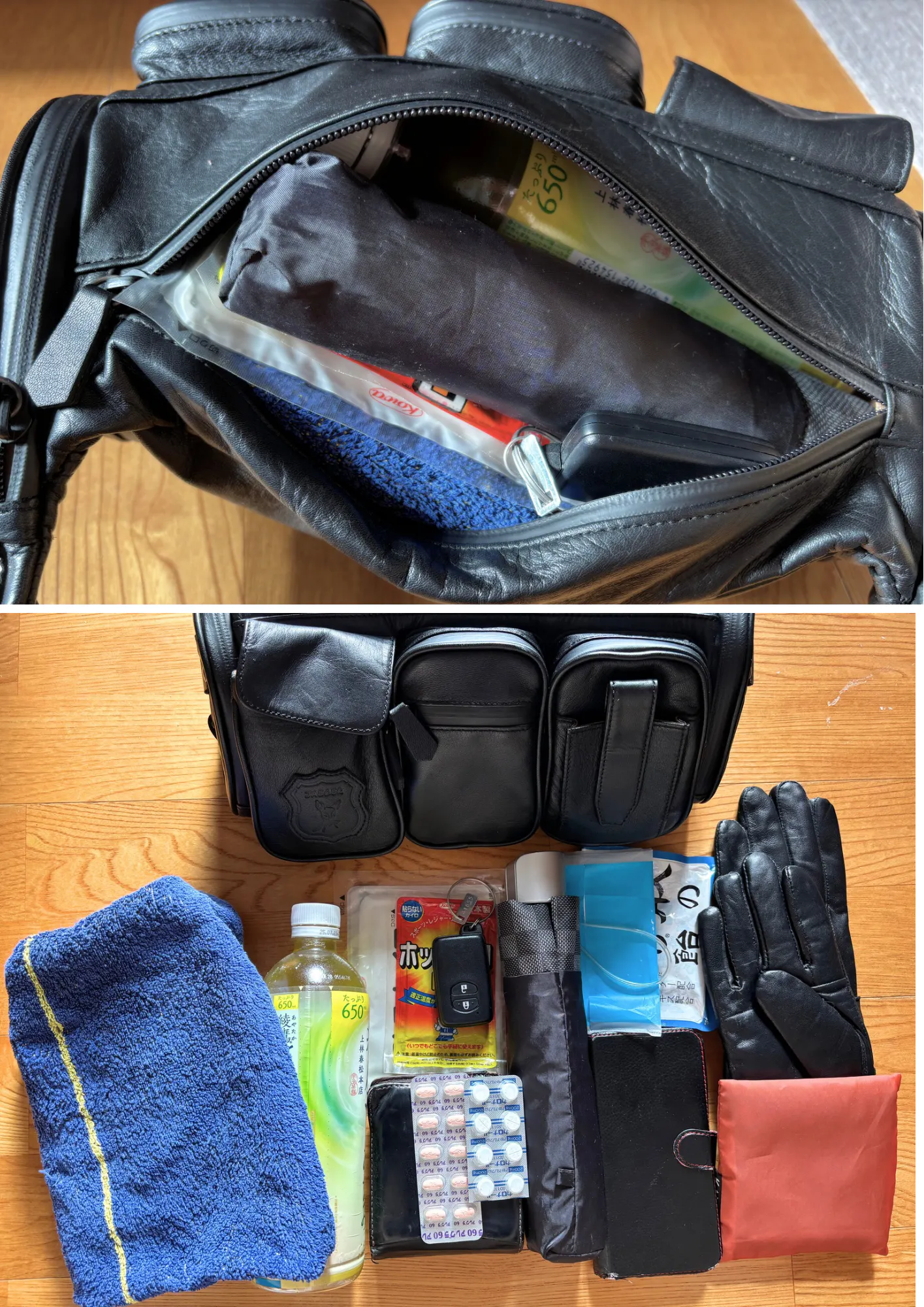 650mlのペットボトル、フェイスタオル、雨具、グローブ、財布、スマートフォン、鍵、ホッカイロ、のど飴、常備薬、ポケットティッシュ、エコバッグがスッポリ入ります。