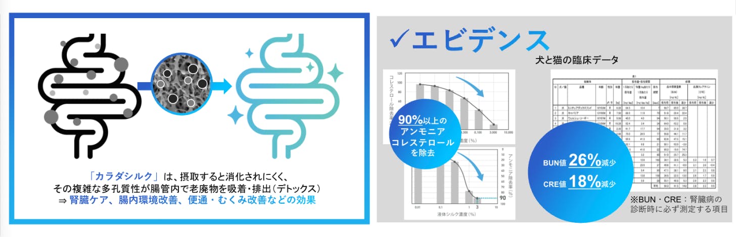 ②「カラダシルク®」を用いた、ヒト用・動物用の腎臓ケア商品(食品・サプリメント・飲料等)の企画・販売